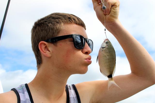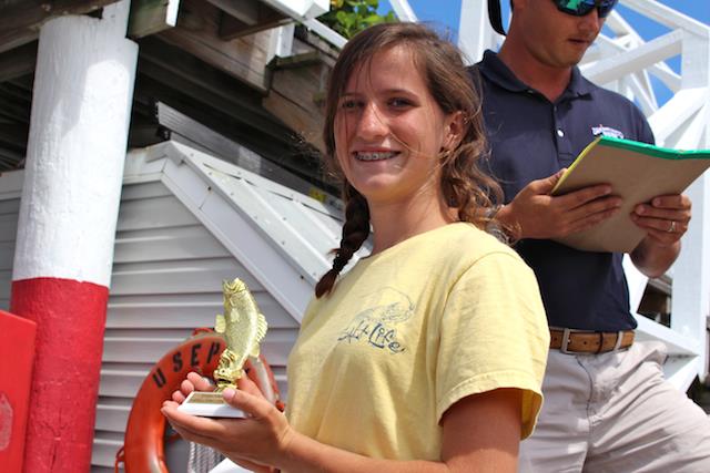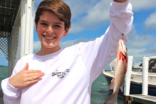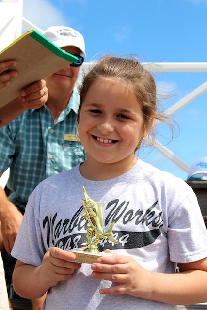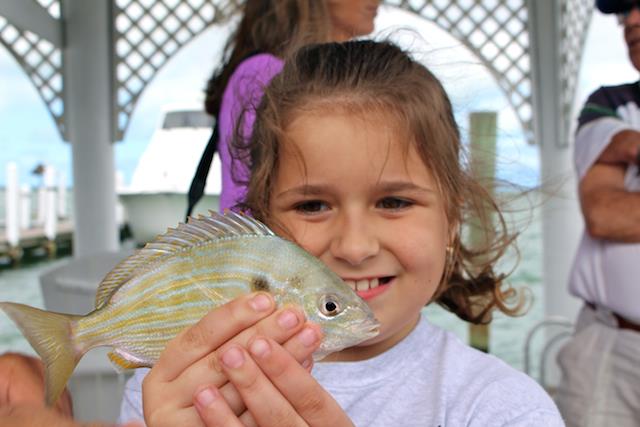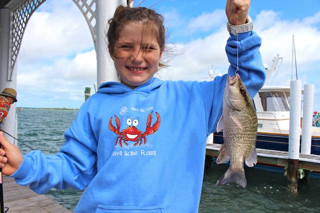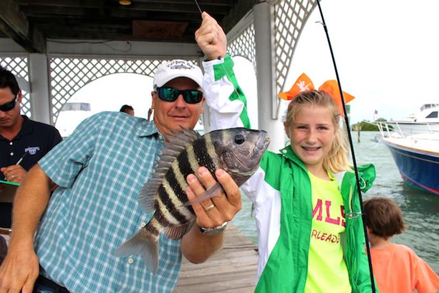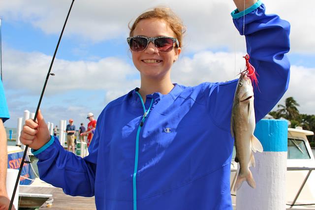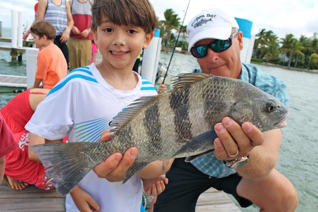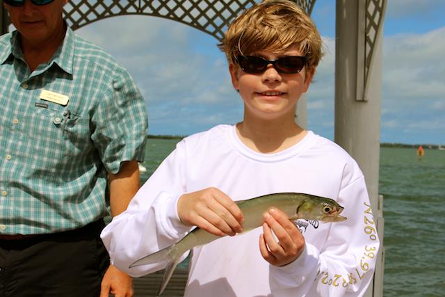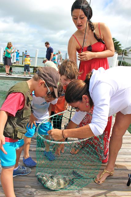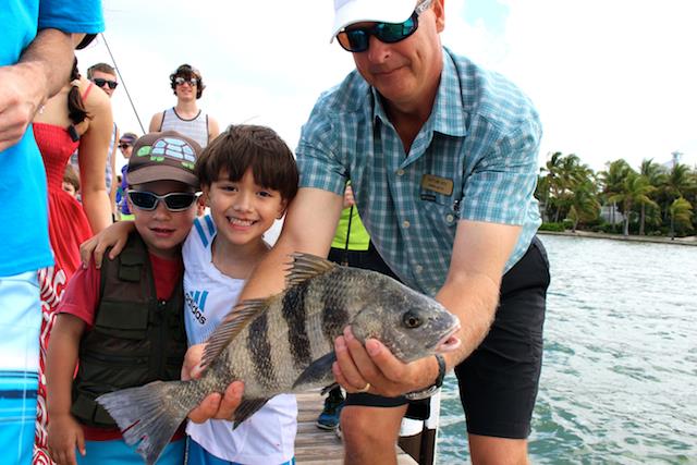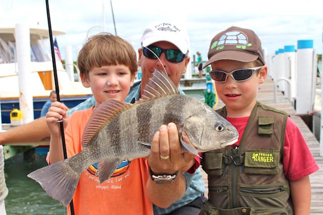 Captain Ken sets the standards. Hands are raised taking the good sportsman Fisherman’s Oath before the first fish is caught. Resident Manager Donald Beckstead measured fish, helped put bait on a line, and when necessary helped a new fisherkid reel in a catch. Sheepshead, Ladyfish, a Flounder and more were all caught and released.