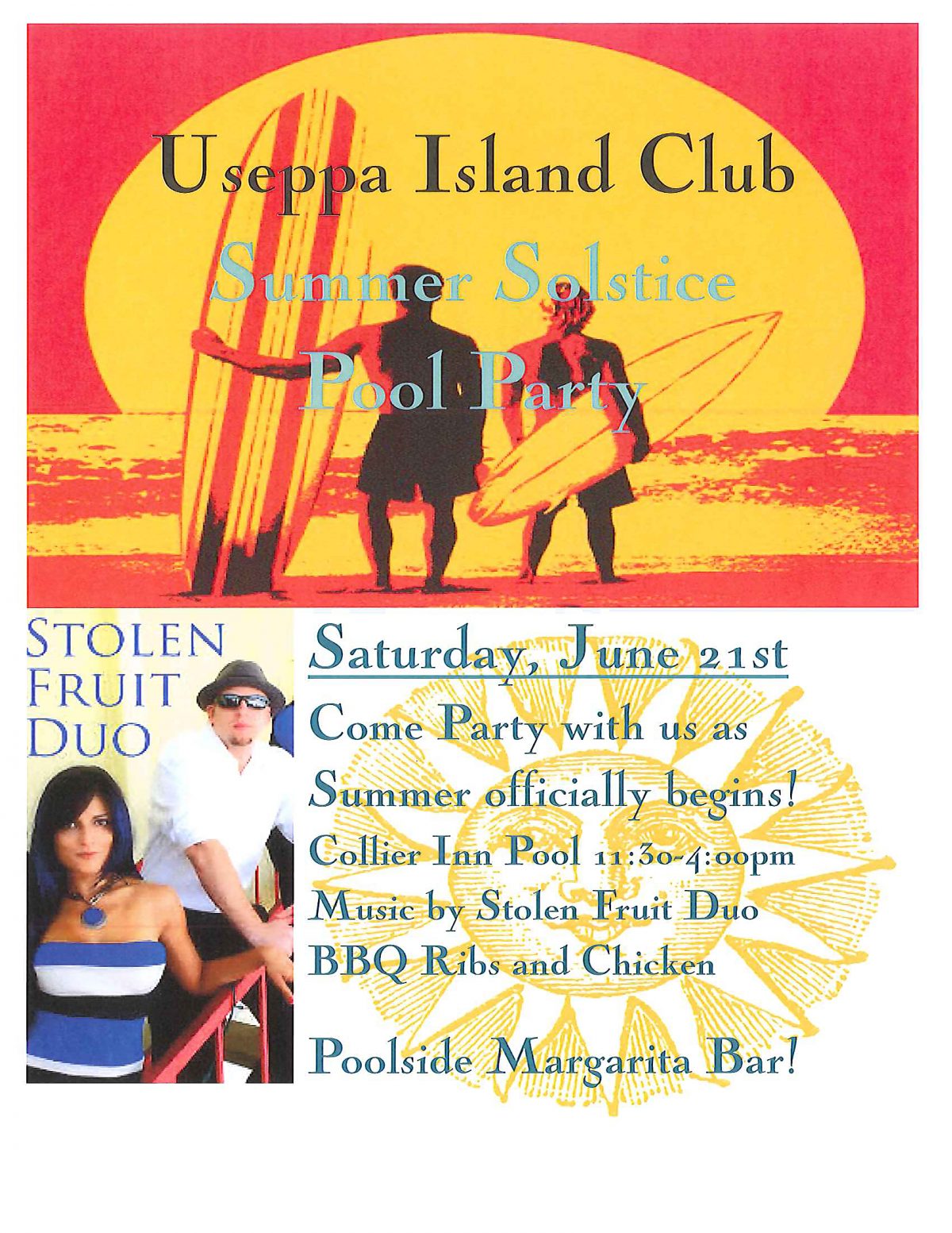 Come celebrate the first day of Summer on the longest day of the year with us on June 21st for our Summer Solstice Pool Party. We will have live music from Stolen Fruit Duo and a Poolside Margarita Bar!!