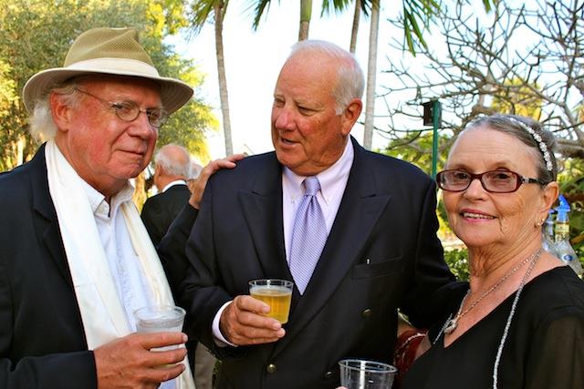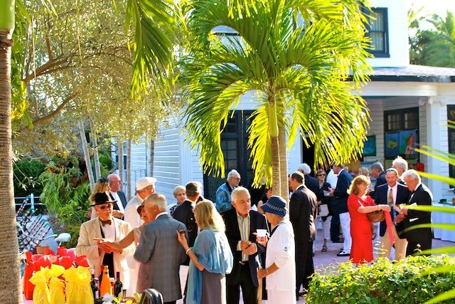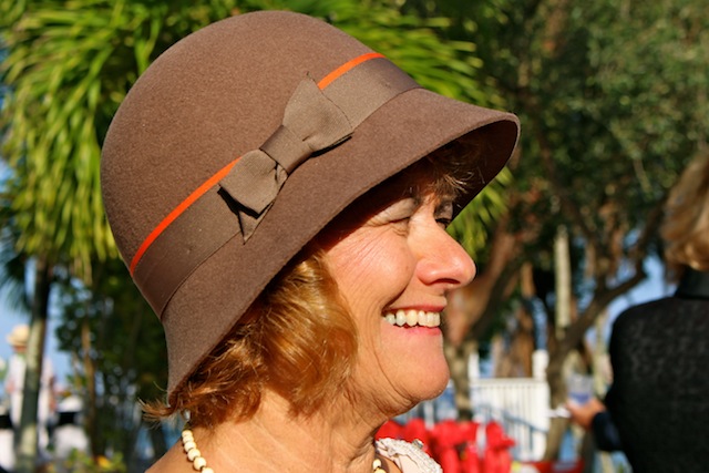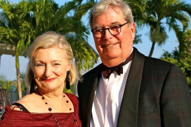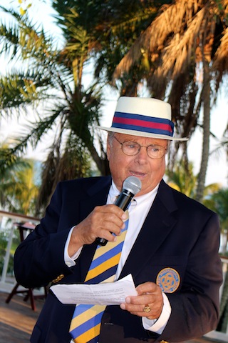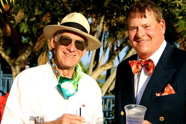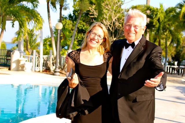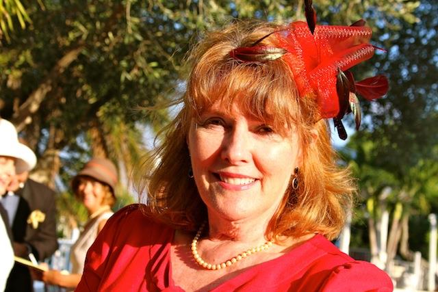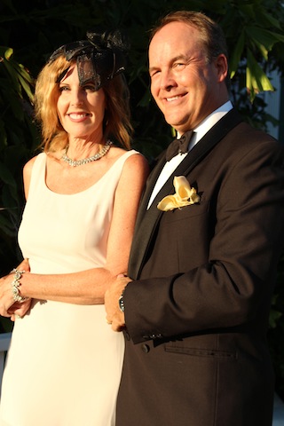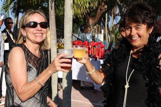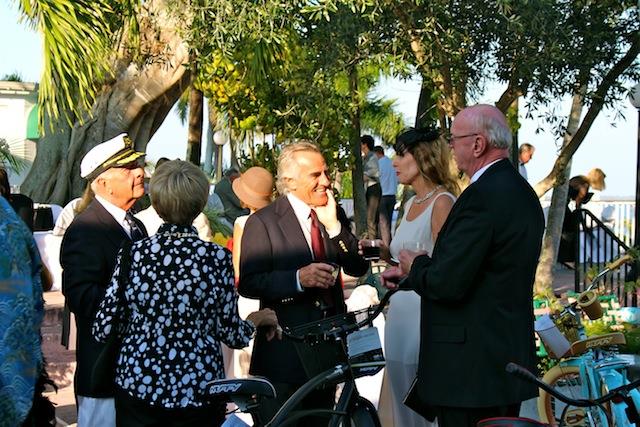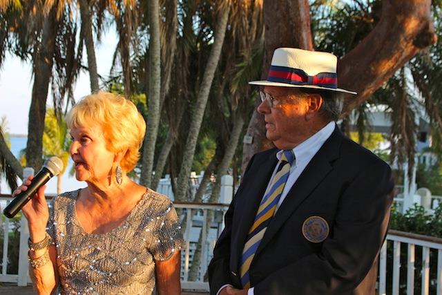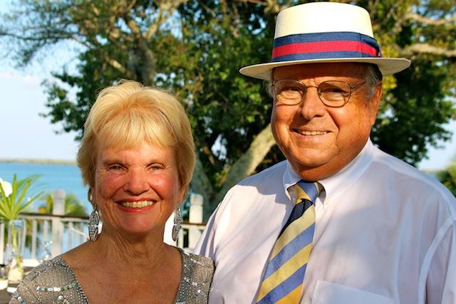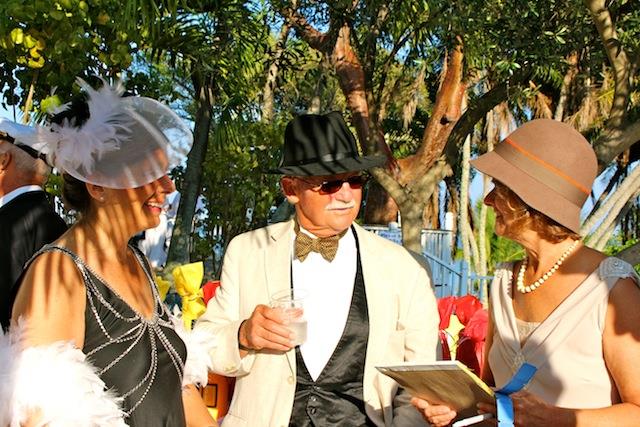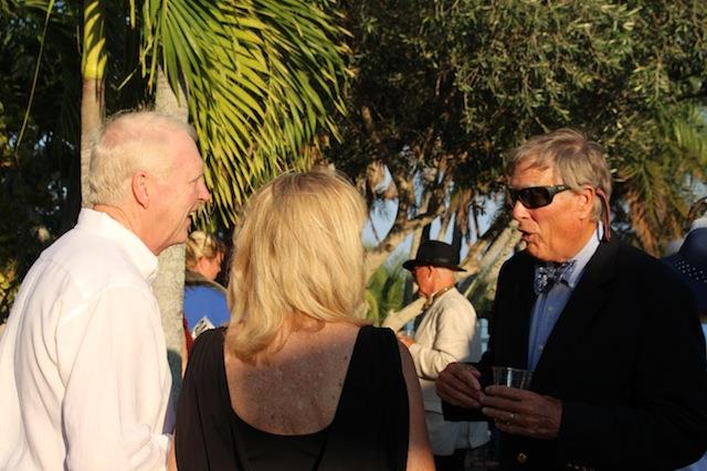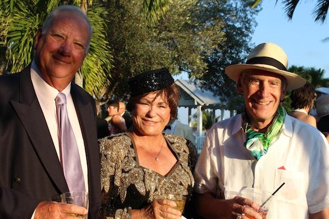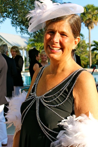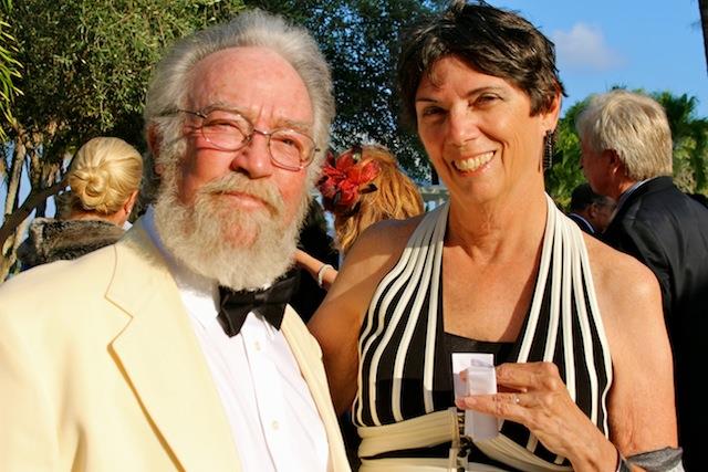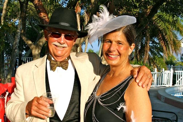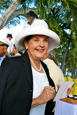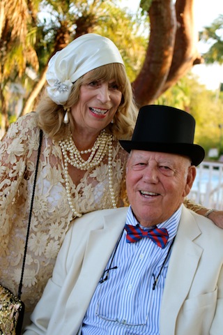 The Useppa Island Historical Society's Fundraiser was just a delightful dinner party for the 79 men and women who attended. The evening was magical - the black and white motif with all the chairs wrapped in white, with black bows, the black and white tablecloths, and the beautiful silk orchids in the center of the tables set the stage. Everyone joined with enthusiasm, dressed as they would have been in 1935. The men were in black tie, many with white dinner jackets, and some in "cruise wear." The ladies came in beautiful dresses, some with hats, and a few in seashore summertime outfits - baggy pants and tops with square shoulders, all in the spirit of the 30's.