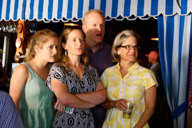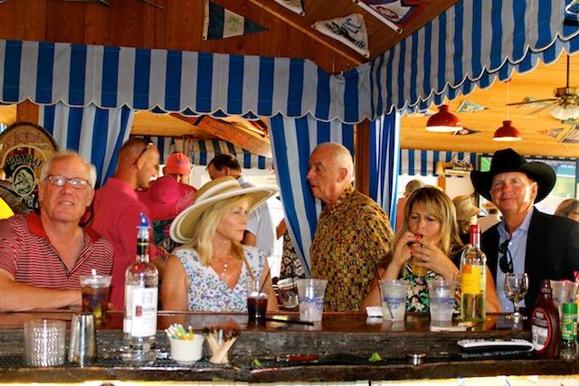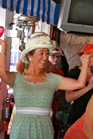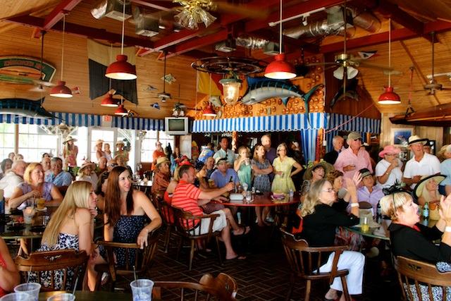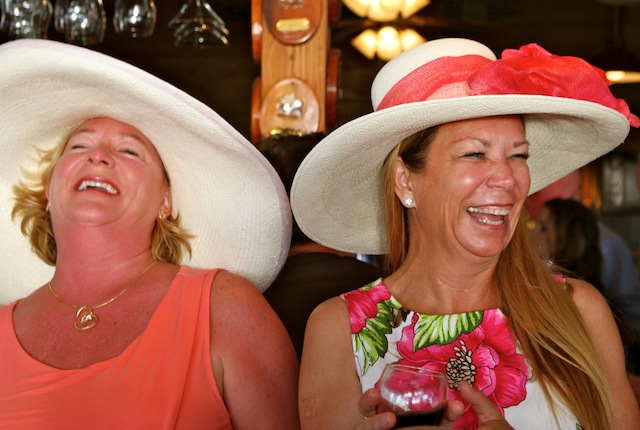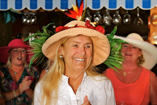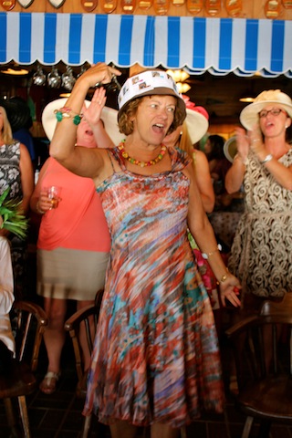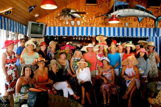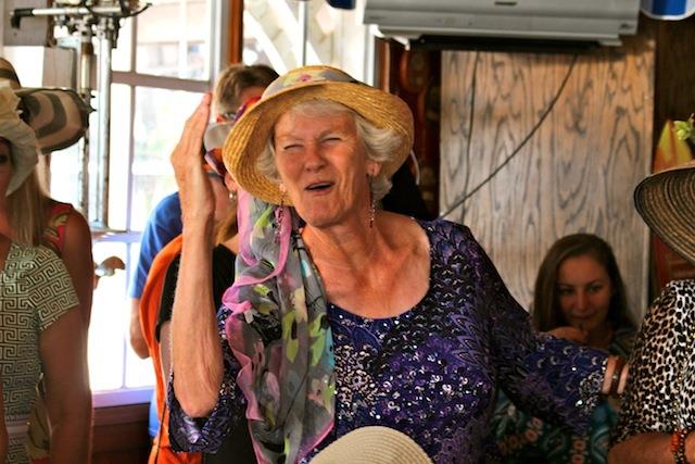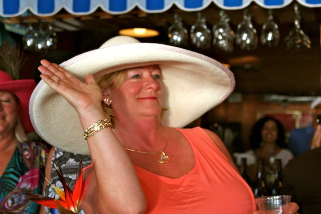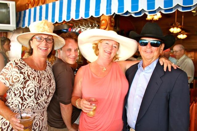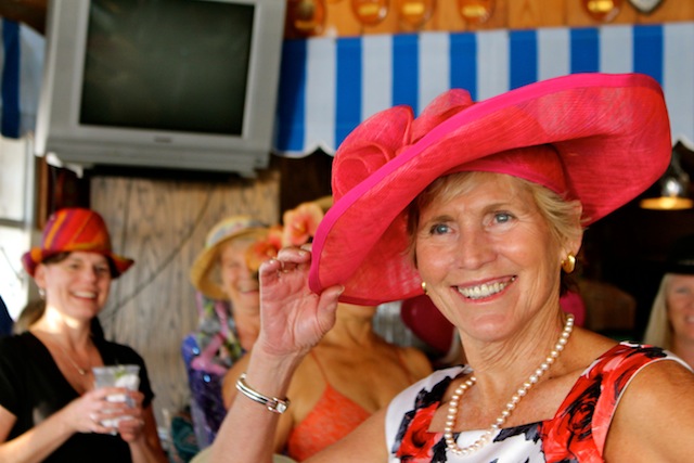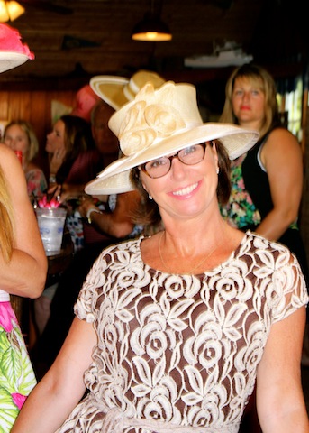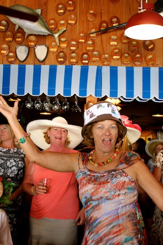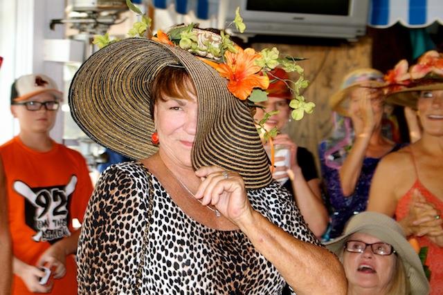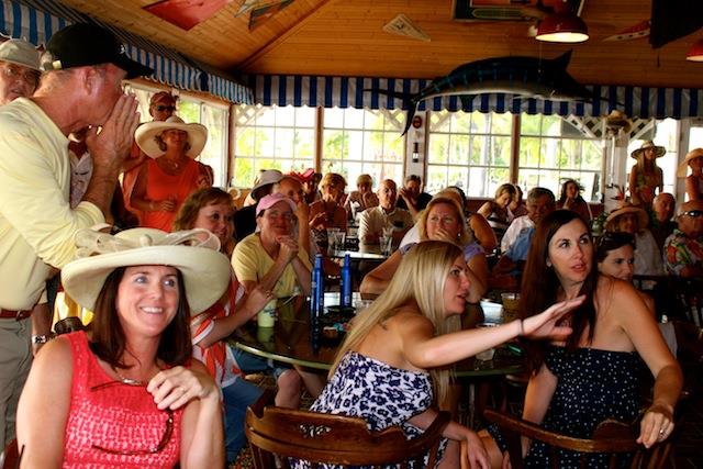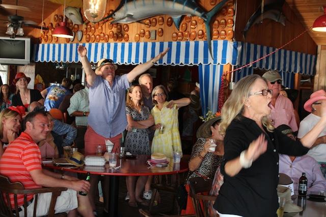 The betting was heavy, the horses were fast, but Best in Show on Useppa went to the outstanding screamers Pason G. and Shane S. It was close as the photographs show, but it was Pason at the end who yelled the loudest when American Pharoah crossed the Derby Finish Line. The Tarpon Bar was full, almost as many hats as partiers. Cheers determined Useppa's Derby Hat Winner. Diana S., last year's winner was disqualified from the finals because of her previous victory. That left three finalists strutting in front of the applauding crowd, but ultimately, the victory went to Mary M. In terms of a party....another Derby win for Useppa.