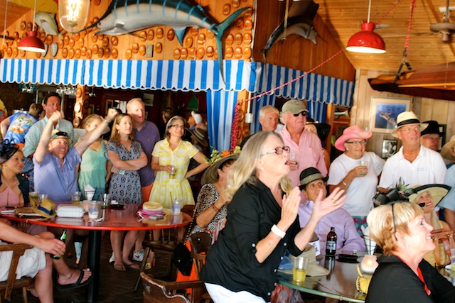 The betting was heavy, the horses were fast, but Best in Show on Useppa went to the outstanding screamers Pason G. and Shane S.  It was close as the photographs show, but it was Pason at the end who yelled the loudest when American Pharoah crossed the Derby Finish Line.  The Tarpon Bar was full, almost as many hats as partiers.  Cheers determined Useppa's Derby Hat Winner.  Diana S., last year's winner was disqualified from the finals because of her previous victory.  That left three finalists strutting in front of the applauding crowd, but ultimately, the victory went to Mary M.  In terms of a party....another Derby win for Useppa.