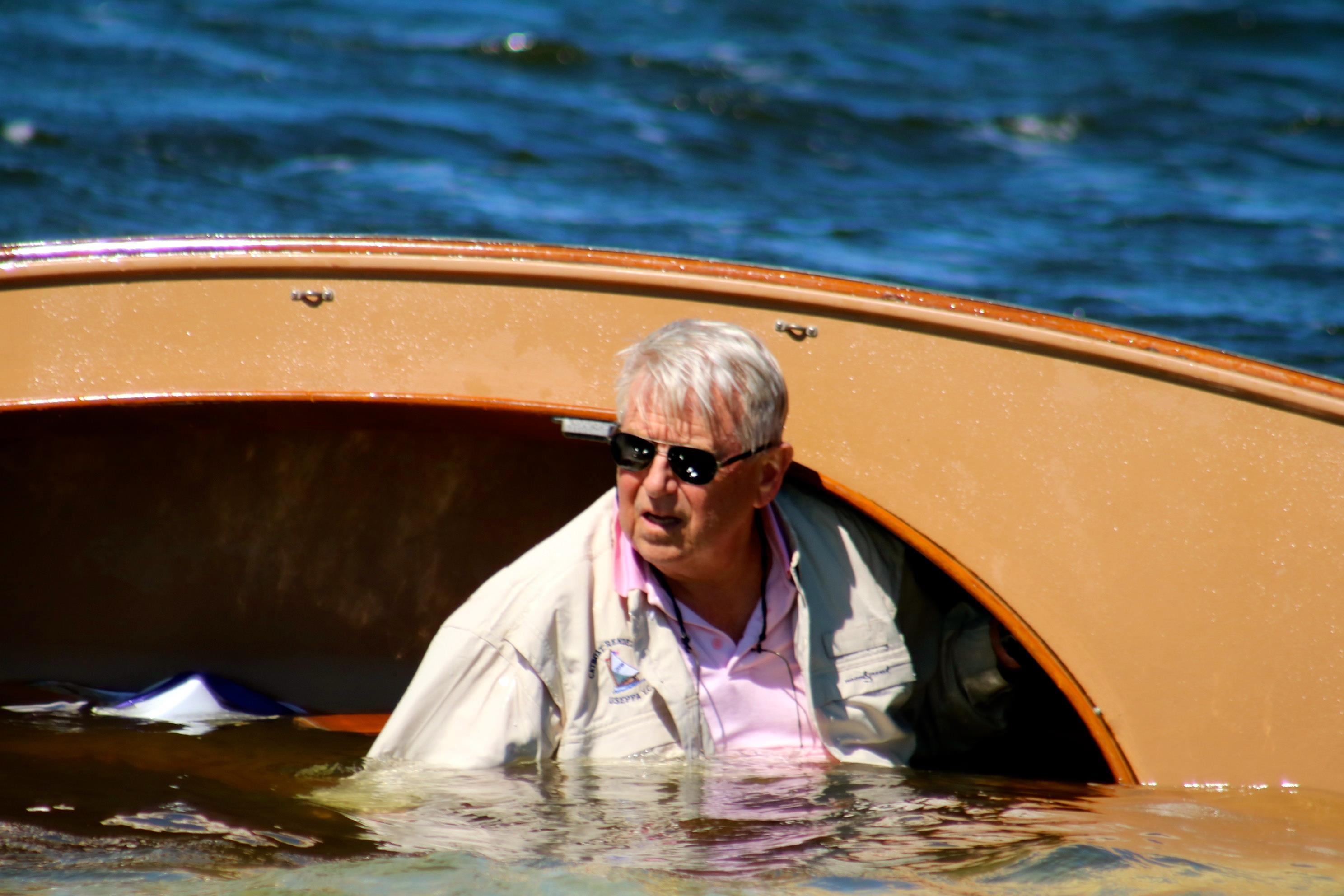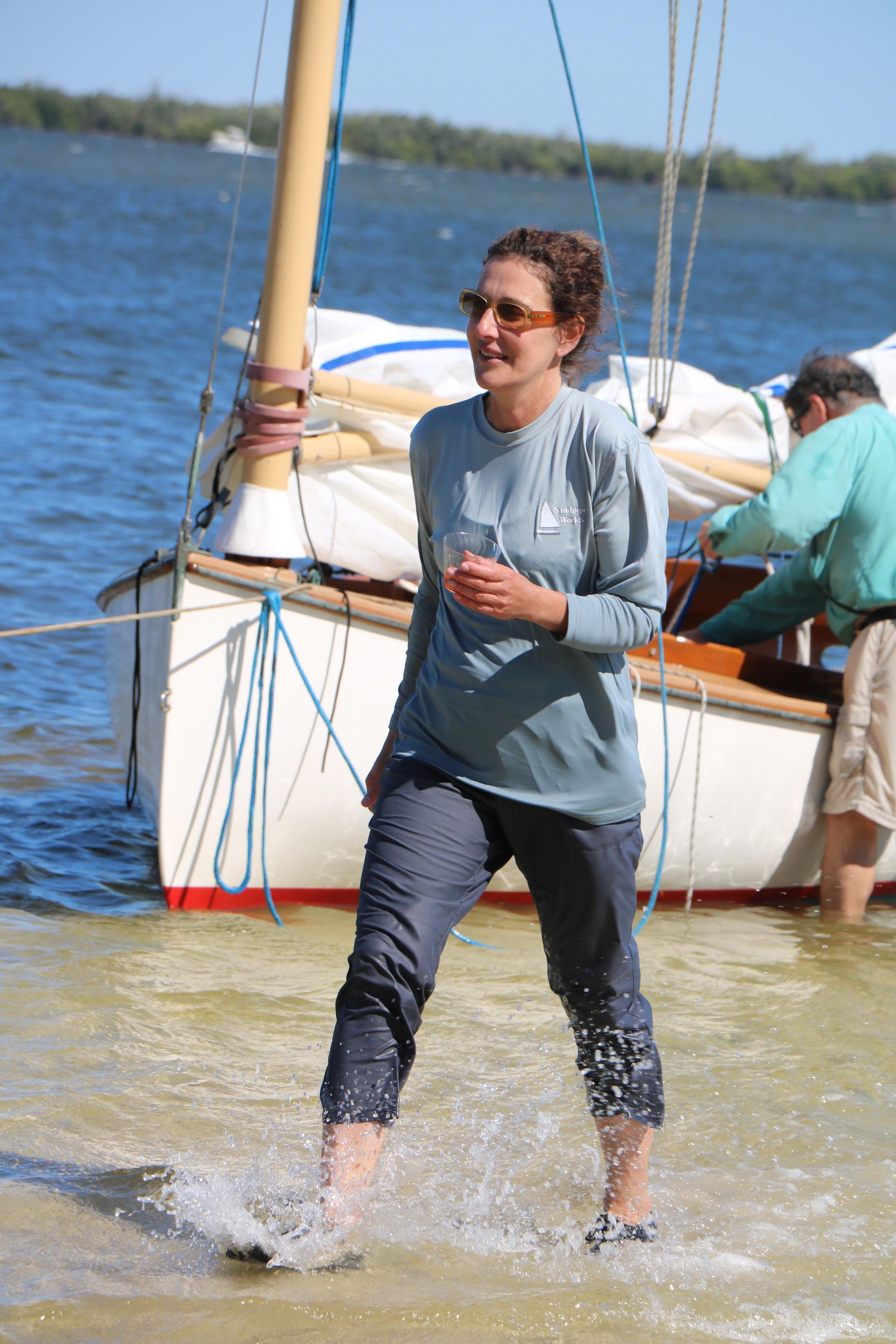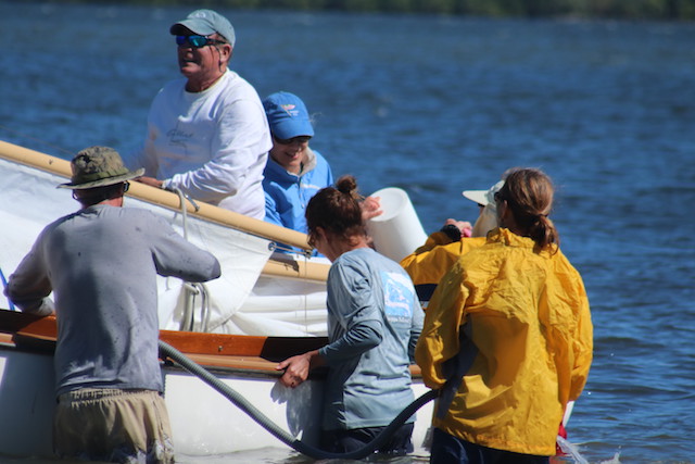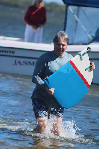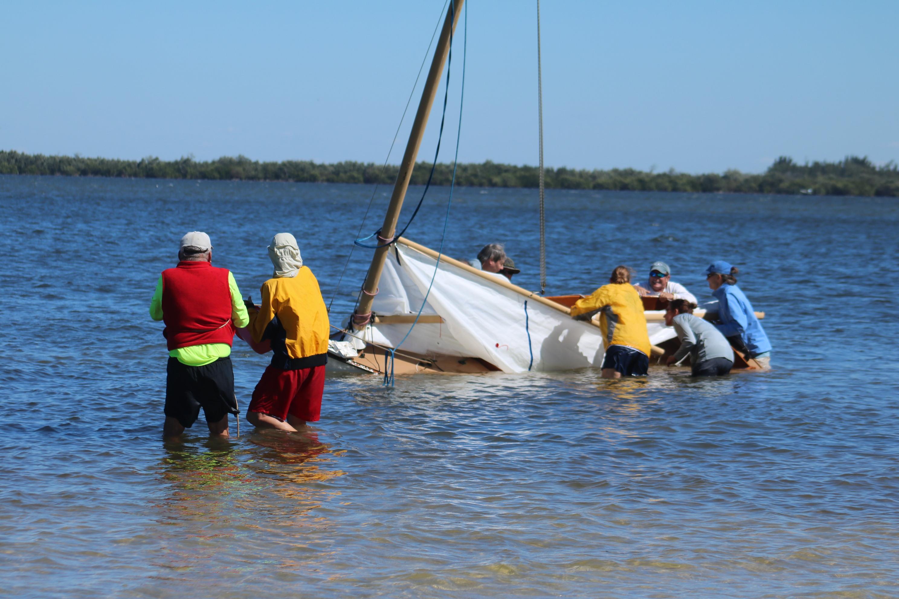 Just before reaching the beach, Geoff Marshall whose family built the first Marshall Cats, climbed aboard the water logged boat, and righted the sails to enable a smooth landing.
