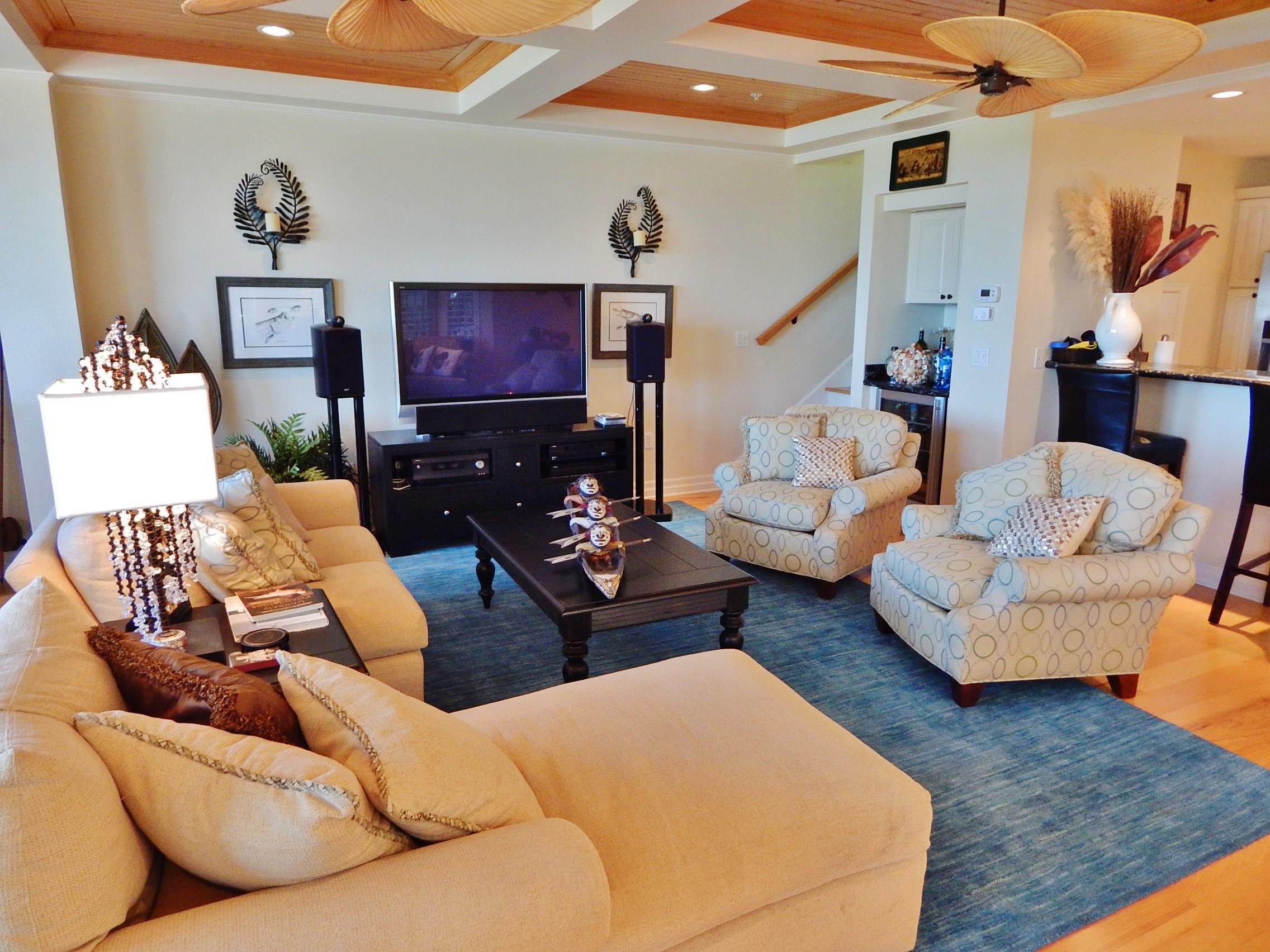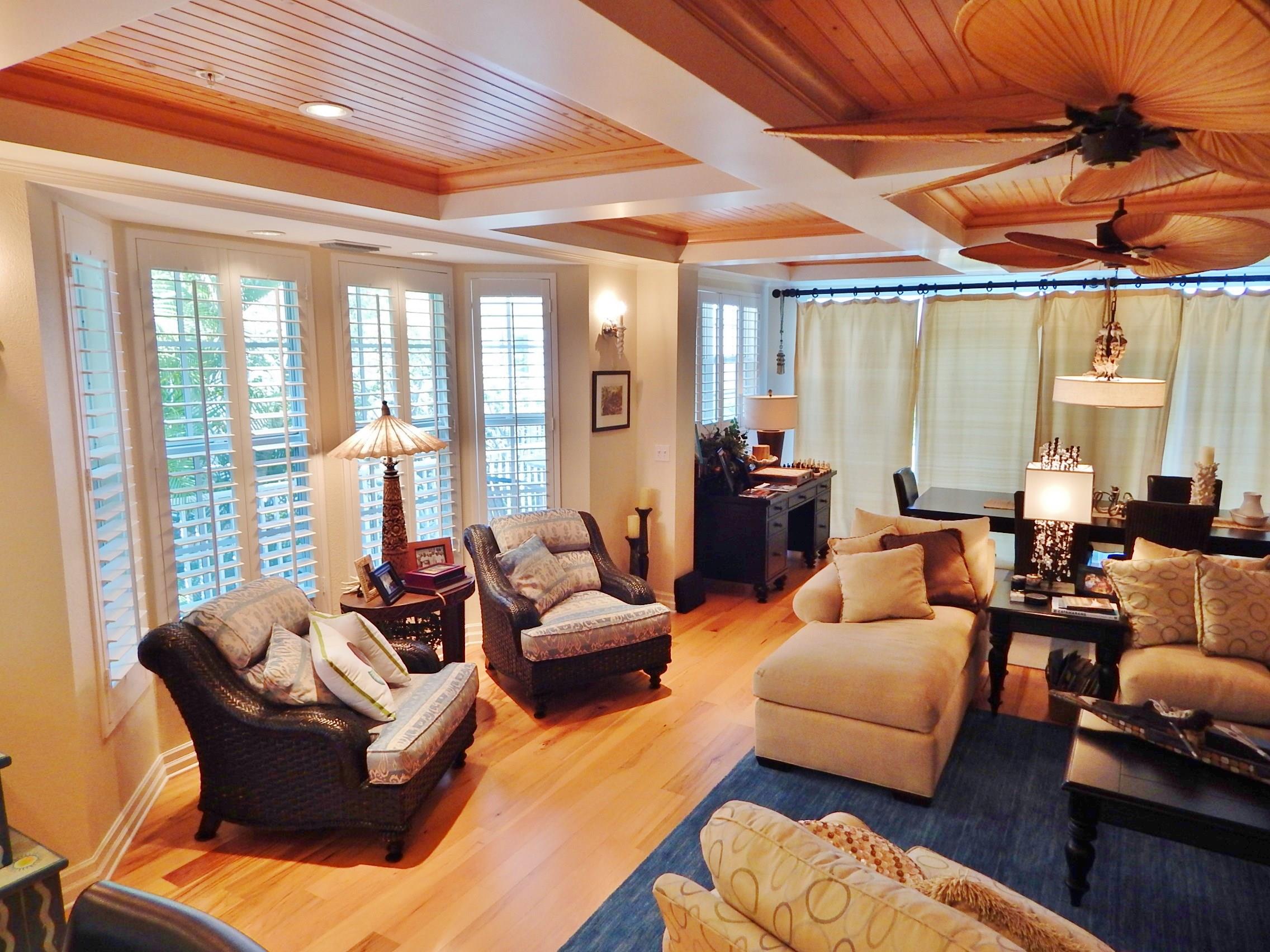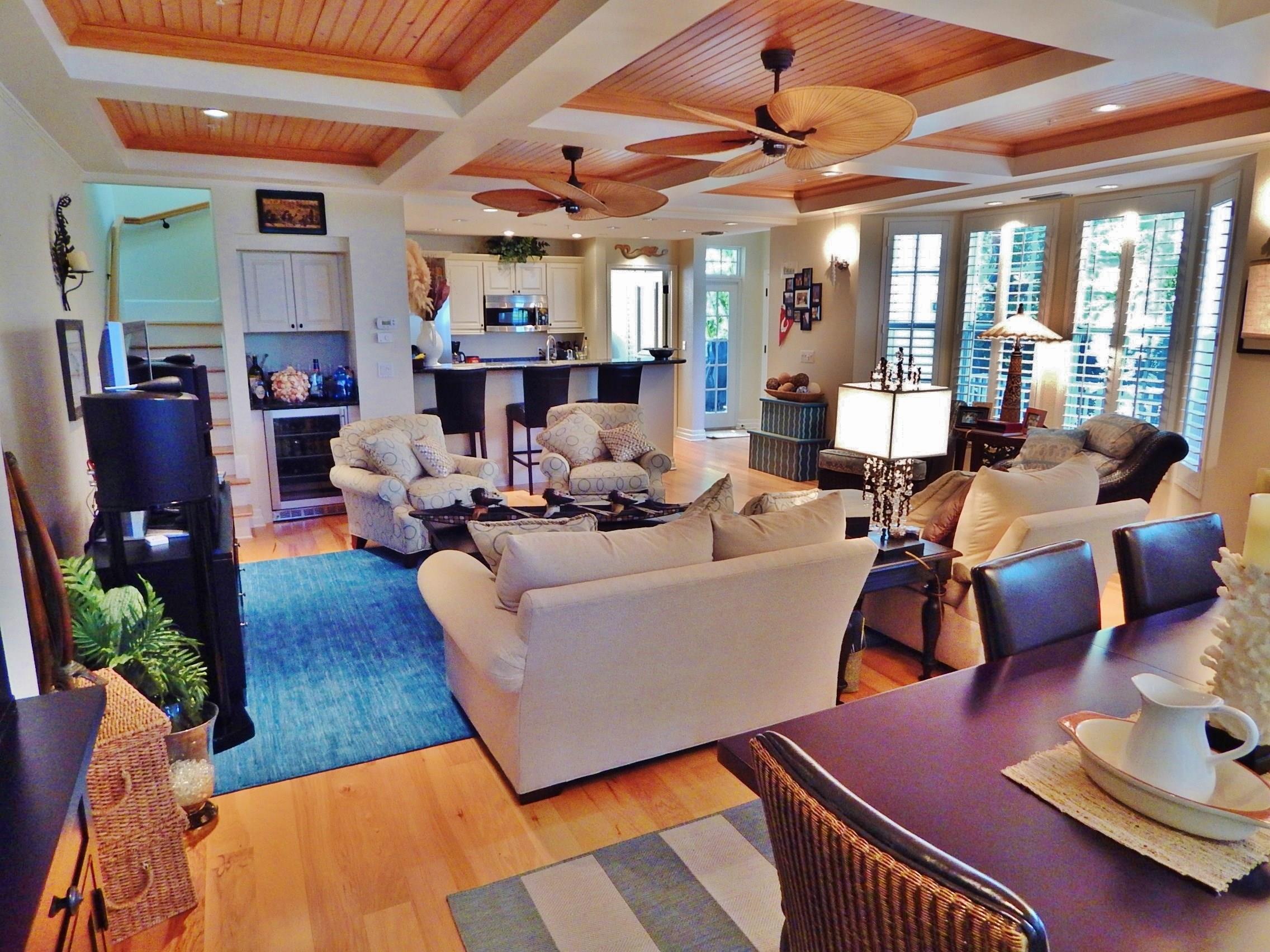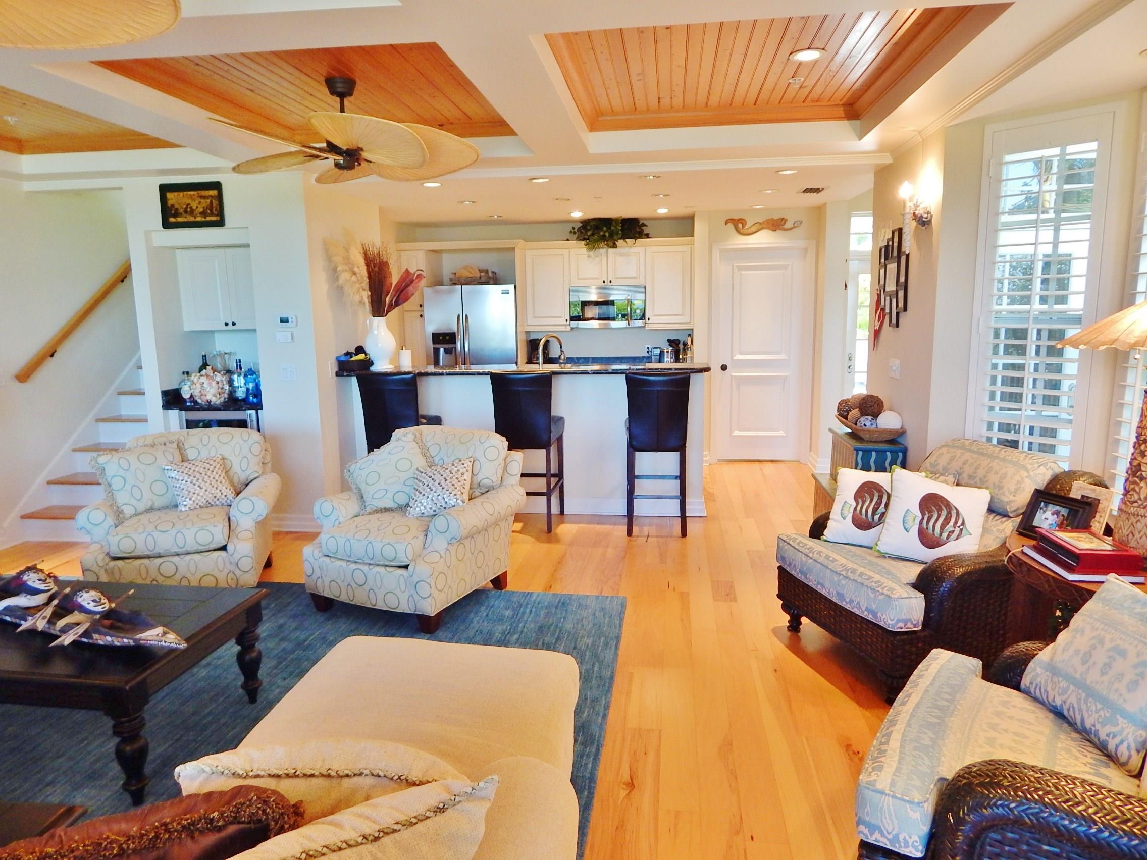The cottage interior is adorned with some of the finest materials available and finished with a luxurious island touch. Hardwood floors light in color give the living areas the feeling of openness. Matching wood paneling on the tray-ceilings open things up further and offer an additional touch of luxury. Each of the three bathrooms are appointed with rustic yet tasteful tile and feature a unique variety of stone countertops.