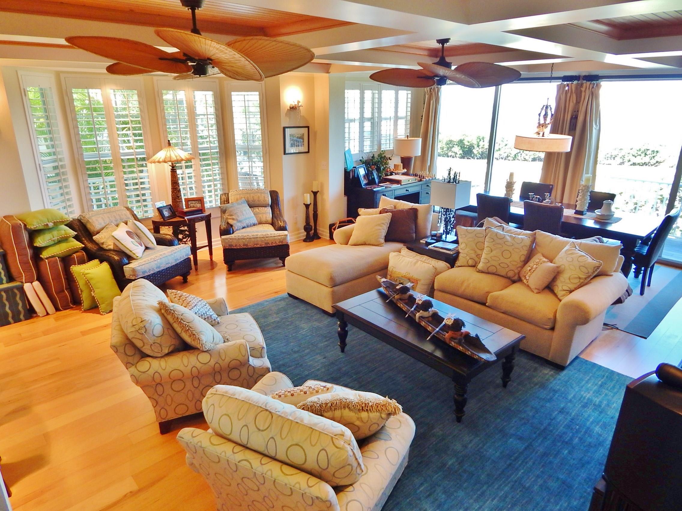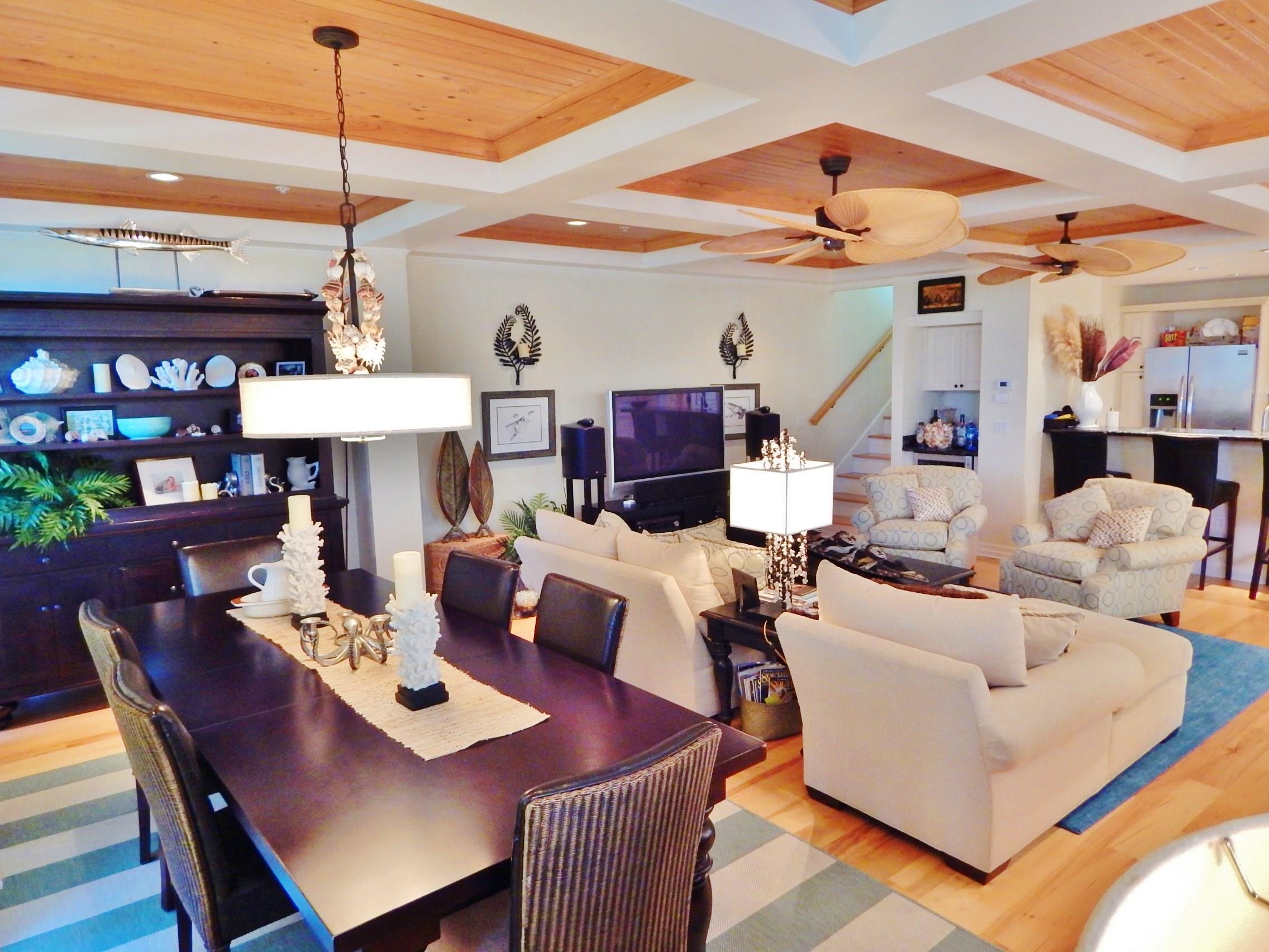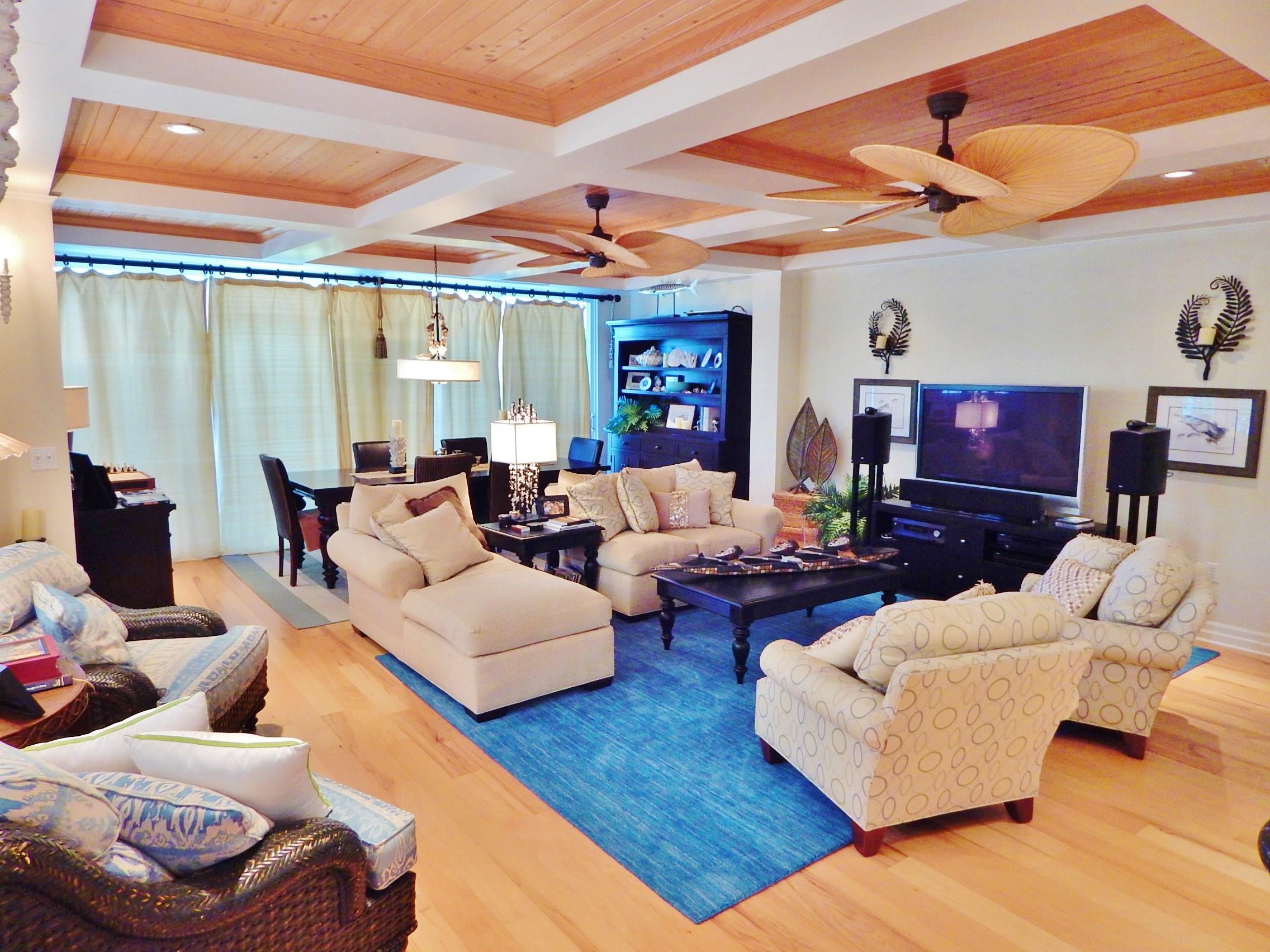 The cottage interior is adorned with some of the finest materials available and finished with a luxurious island touch. Hardwood floors light in color give the living areas the feeling of openness. Matching wood paneling on the tray-ceilings open things up further and offer an additional touch of luxury. Each of the three bathrooms are appointed with rustic yet tasteful tile and feature a unique variety of stone countertops.