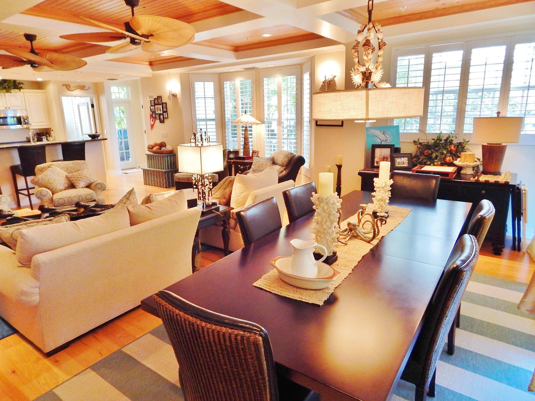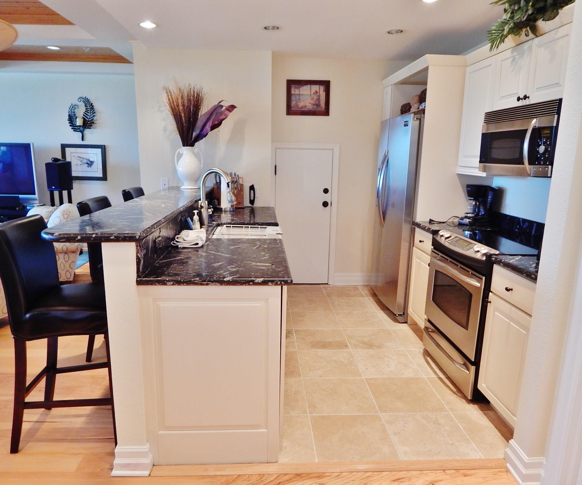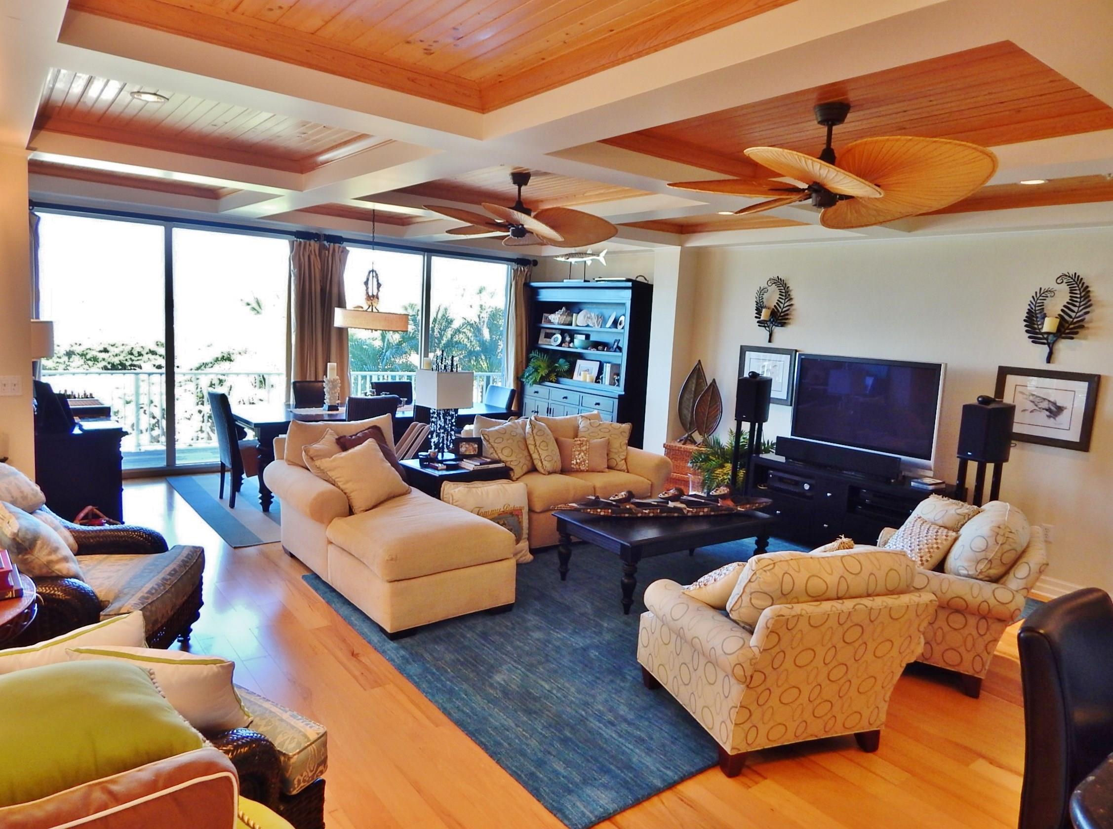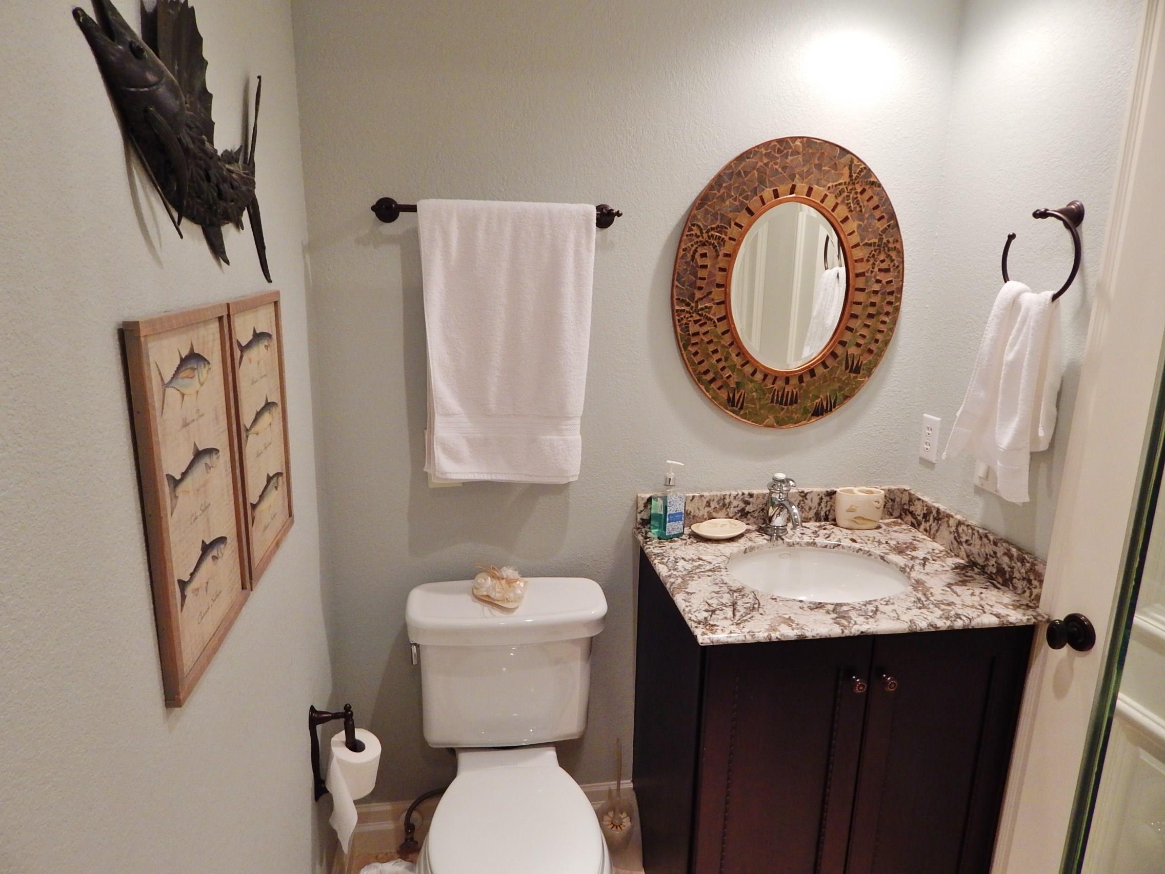 The cottage interior is adorned with some of the finest materials available and finished with a luxurious island touch. Hardwood floors light in color give the living areas the feeling of openness. Matching wood paneling on the tray-ceilings open things up further and offer an additional touch of luxury. Each of the three bathrooms are appointed with rustic yet tasteful tile and feature a unique variety of stone countertops.