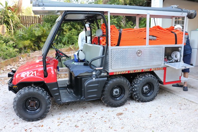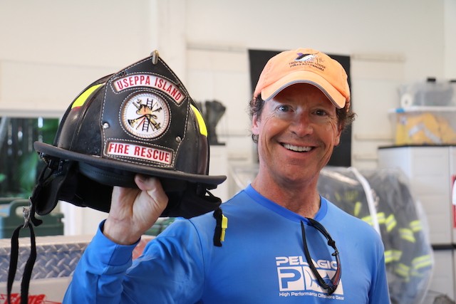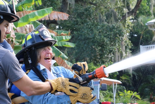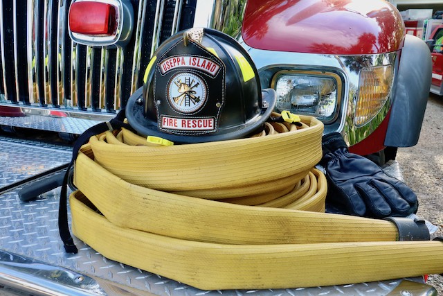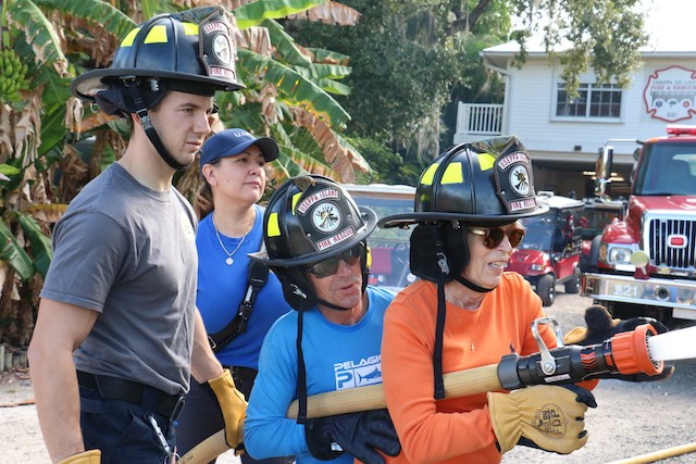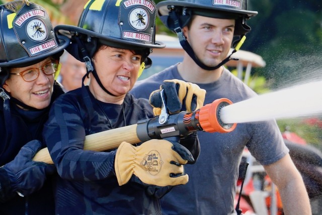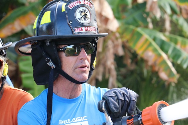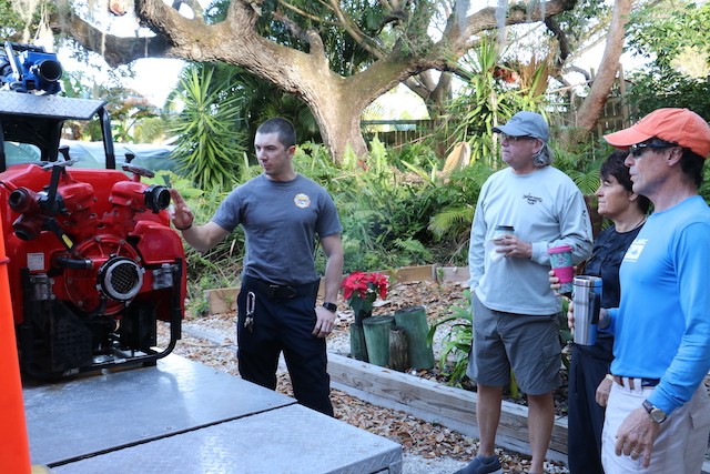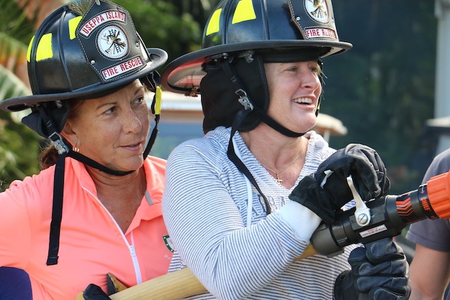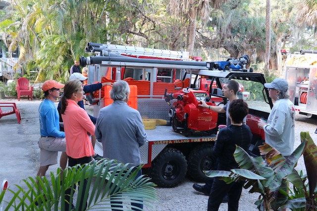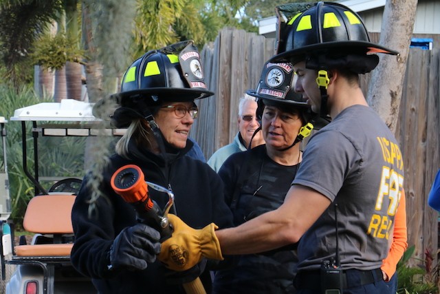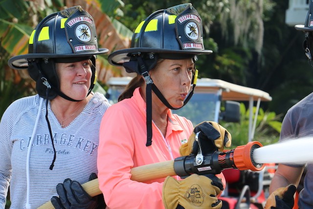 It Takes a Village To Fight a Fire - Thoughts and pictures by UseppaGin - Useppa has its own Fire Department. Chief Maria Silva and Assistant Chief Chris Wilfong working with mainland firefighters Ed Plyaka and others know the Island and its structures. They know the idiosyncrasies of its homes. They have all the necessary equipment for fire and health emergencies. But in a crisis, extra hands might be necessary, jobs shared. Knowledgeable and prepared Island residents might be needed. On Friday January 24th the first 2020 Training Session was held. Homeowners were invited to the Firehouse and showed equipment, told how it was used. Procedures were explained, and then the highpoint for many was … a chance to actually put a helmet on, use the fire truck hose. Thank you to Chief Maria, Chris and Ed for leading our first class.