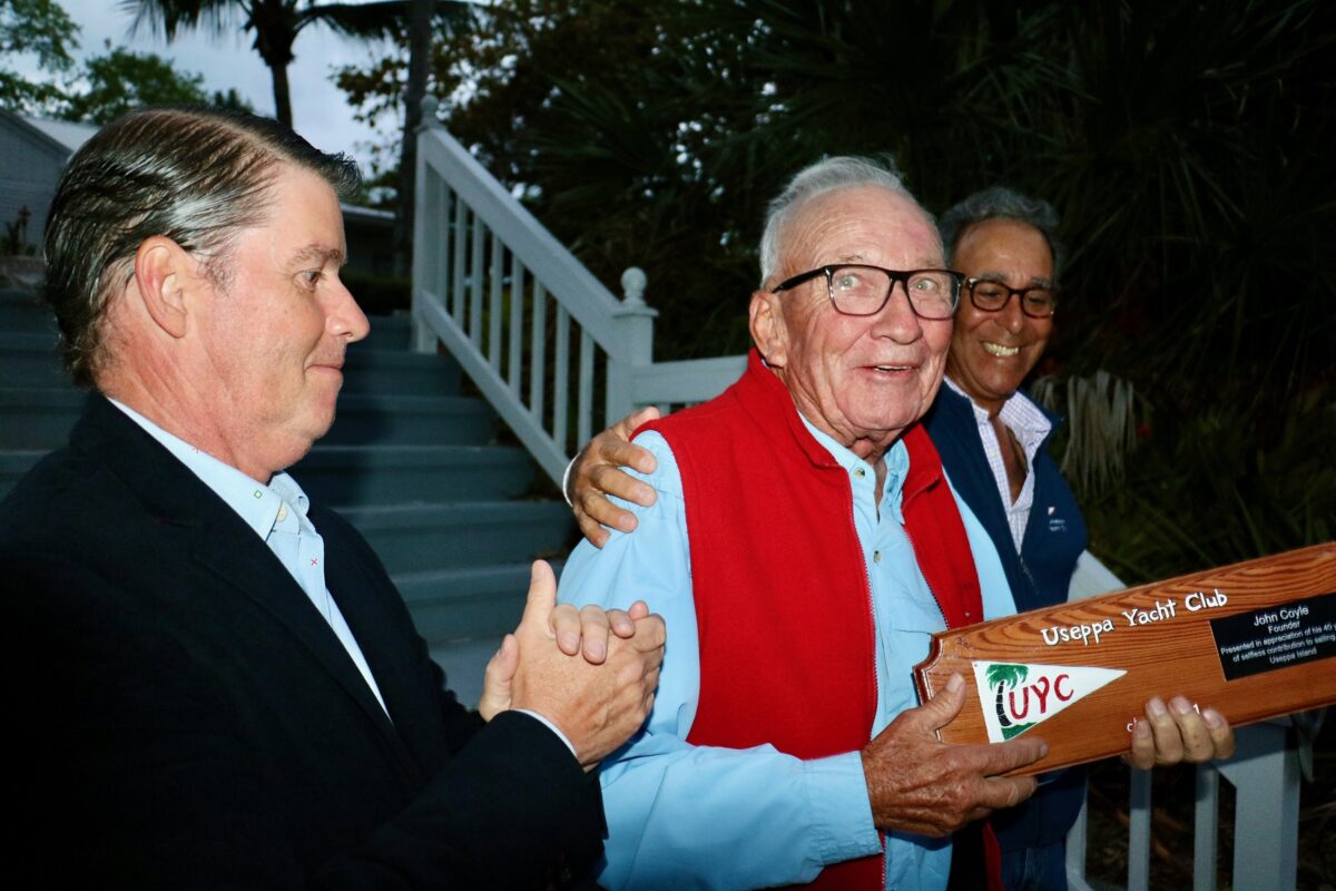 McMahon Regatta Awards – Pictures and Thoughts by UseppaGin – Trophies were given. Paul Beisswenger and Doug Ryan’s victory in the 2021 McMahon Catboat Regatta was celebrated in a beachside dinner Saturday, March 20th. Second Place Winners Ed King, Kim Lockhart and Jack David and Third Place Winners George Preckwinkle and Commodore Steve Acuff were applauded. John Coyle, one the club’s founders, was given a special award. Today’s Useppa Yacht Club still operates under its 1981 original rules… 1. NO DUES 2. NO CLUBHOUSE 3. NO RULES. Michael Albert presented John’s award “In recognition of all he has done for forty years to make Useppa’s Yacht Club the center of our social lives here during the winters.” Bob and Sydney Stevens were also given a special award for doing so much for sailing on Useppa for over twenty years. Honor was also paid to Pat McMahon in whose late husband Jack’s honor the regatta is named. Long time sailors “Old Salts” posed for a picture. The night was one more memorable Useppa evening.