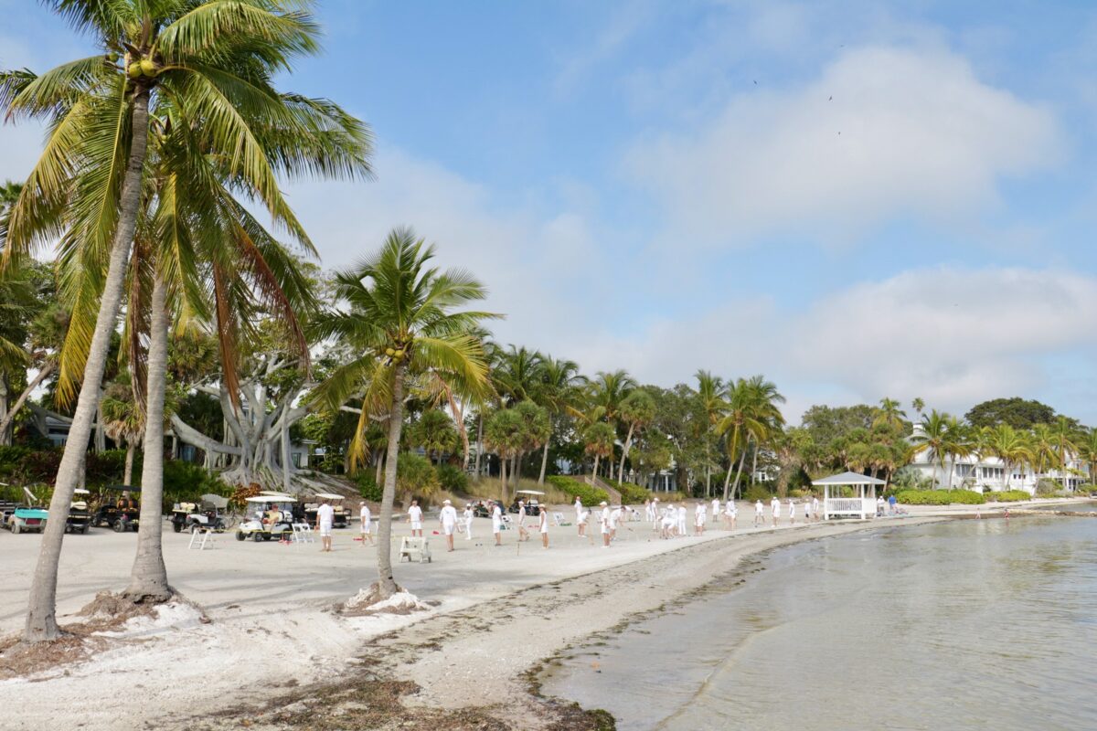 2021 Useppa Beach Croquet Tournament – Thoughts by Mike Albert and Pictures by UseppaGin – Every December 30th since 1978 residents and members of the Useppa Island Club gathered to play in a 9 Wicket Tournament. Most years this drew upwards of 64 players. This year’s event was limited to 32 players because of Covid concerns. The only two times the tournament wasn’t held were 2004 when the island was recovering from a direct hit by Hurricane Charlie and last year 2020 when the pandemic shut operations down worldwide. The Service Departments spends several days leading up to the 30th raking and leveling the beach before laying out the courts. This year we played on eight courts which allowed all sixteen teams to play at the same time. Everyone played four games. Prize “Mallets” are awarded to the winners in each quadrant. This year’s final match for the championship was between Michael Carmichael and Mark Goodman against Tor Carlson and Karen Connery-Albert. The last time Karen played this tournament was thirteen years ago when her partner was once again Tor Carlson at that time halfway through the ninth grade. This year’s matchup had all the stars aligned. Tor and Karen played a beautiful game and pegged out both balls a couple of wickets ahead of Michael and Mark to be 2022 Useppa 9 Wicket Champs.