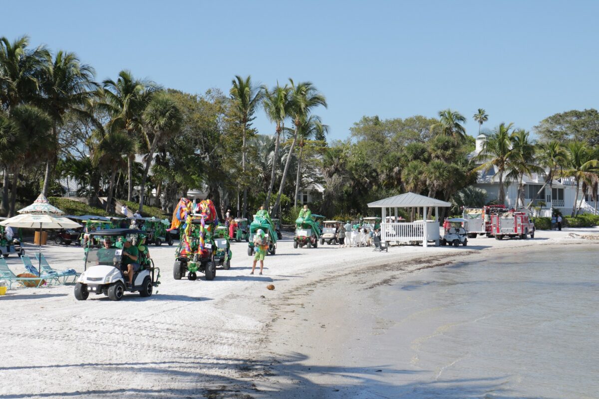 Saint Patrick’s Day Island Style – Thoughts and Pictures by UseppaGin – Led by the Fire Department, decorated golf carts filled with friends, children, parents, and grandparents paraded up and down the beach. Other Islanders including Great-grandmother Keekee cheered them on. Judges were old time Useppans who once upon a time strutted and marched themselves. Their smiles were just as big handing out awards. The Grand Prize Winners were two carts… The Oseppa Man and The Oseppa Woman. Spirits of Useppa are still shaking their heads. It was a day filled with just the right amount of blarney and fun.