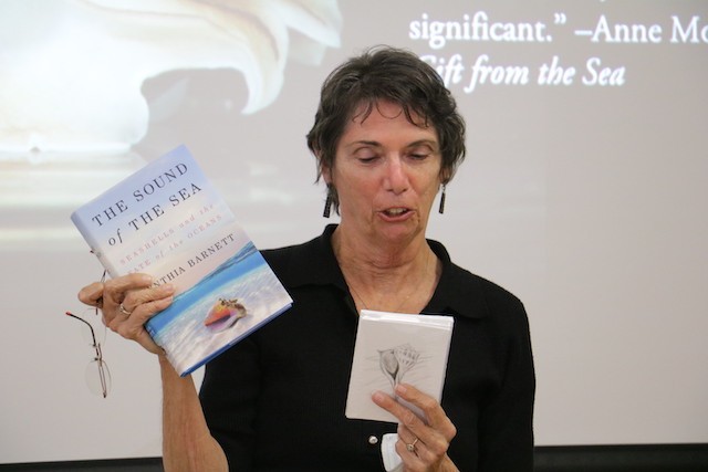 Cynthia Barnett and The Sound of the Sea on Useppa - Thoughts and Pictures by UseppaGin - Useppa shell mounds were built hundreds of years ago by Calusa Indians, lived on then and lived on now. Saturday night, February 26th, award winning environmental journalist Cynthia Barnett spoke to an intimate gathering at the Barbara Sumwalt Museum about her book The Sound of the Sea… seashells and the fate of the oceans. Shells have been collected for a hundred thousand years. “They were money before coins, jewelry before gems, art before canvas.” Barnett spoke with reverence, humor, and scientific knowledge about the shells we see everywhere on the island, about shells found worldwide.