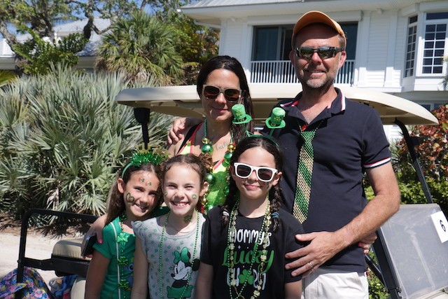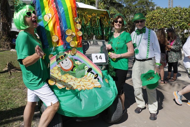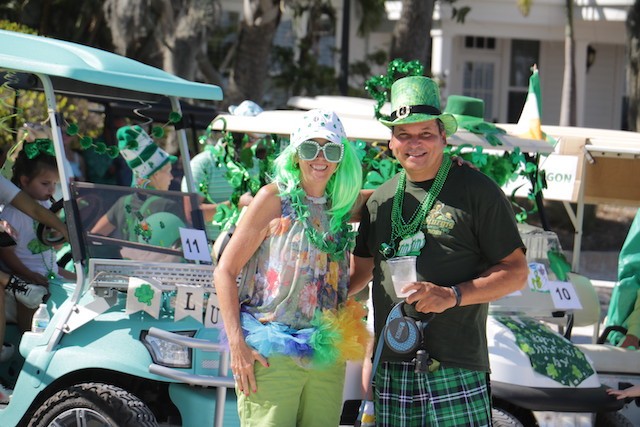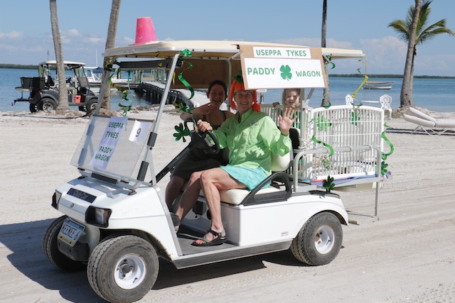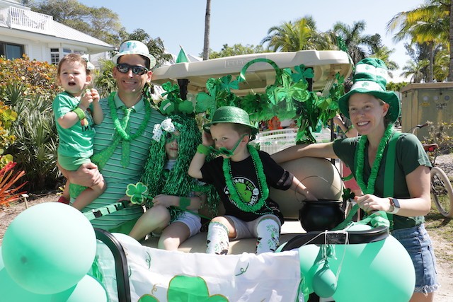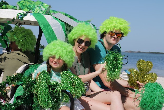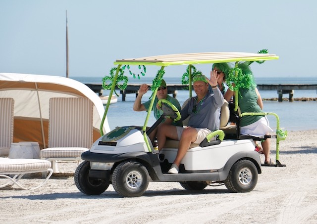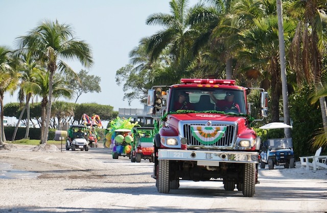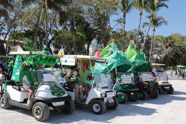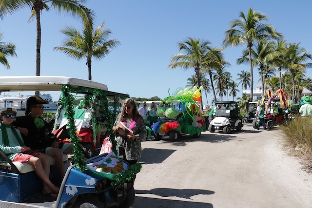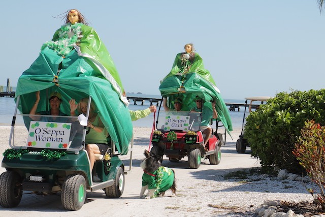 Saint Patrick's Day Island Style - Thoughts and Pictures by UseppaGin - Led by the Fire Department, decorated golf carts filled with friends, children, parents, and grandparents paraded up and down the beach. Other Islanders including Great-grandmother Keekee cheered them on. Judges were old time Useppans who once upon a time strutted and marched themselves. Their smiles were just as big handing out awards. The Grand Prize Winners were two carts… The Oseppa Man and The Oseppa Woman. Spirits of Useppa are still shaking their heads. It was a day filled with just the right amount of blarney and fun.