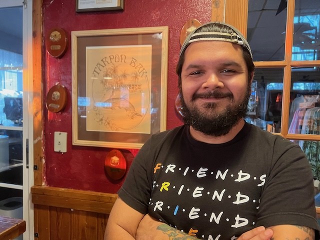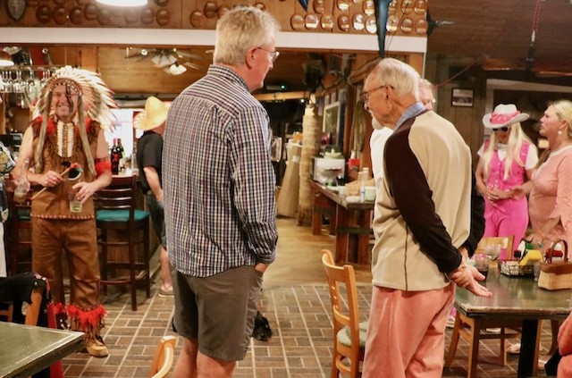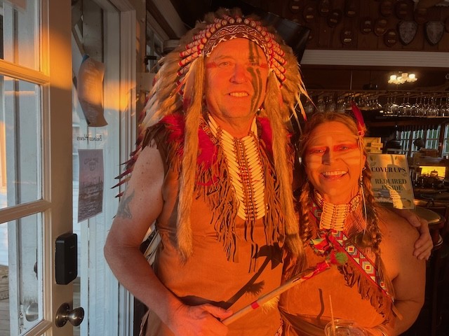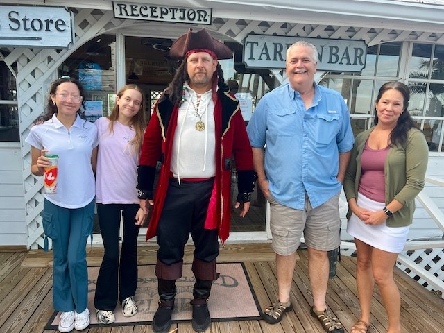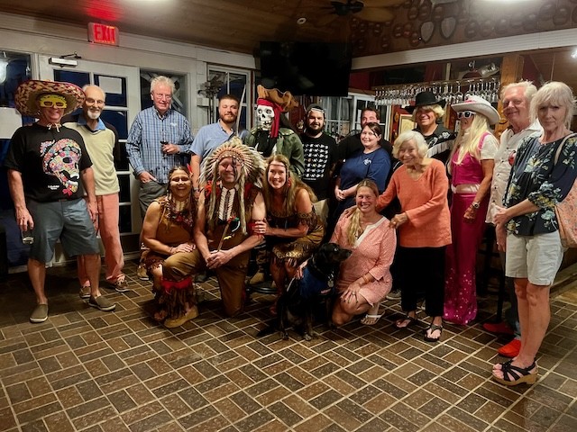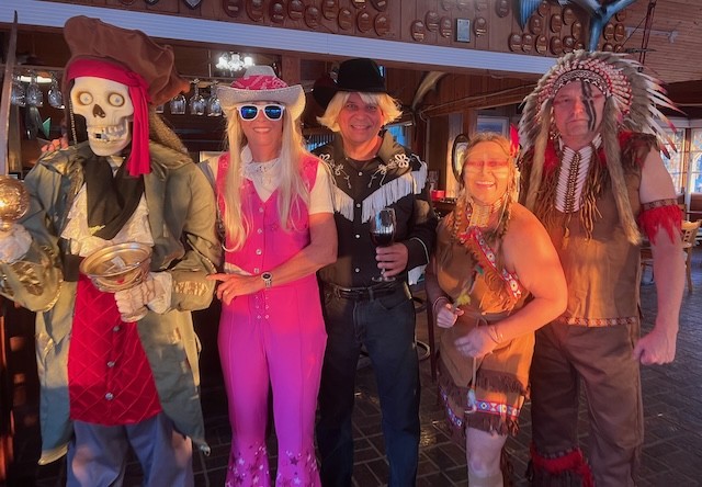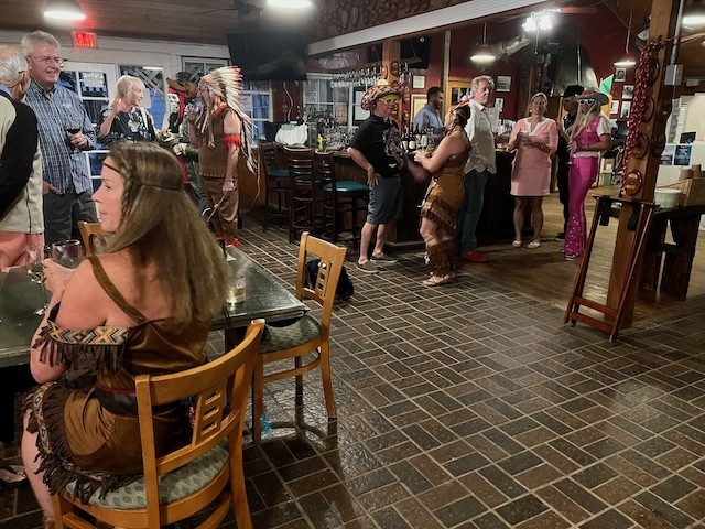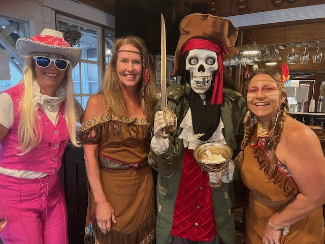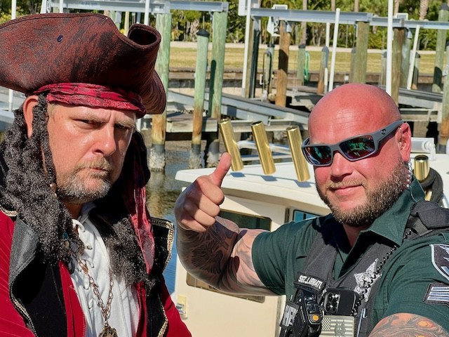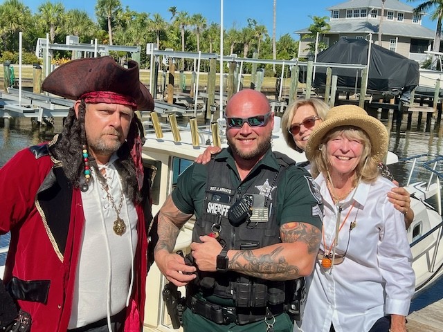 Halloween Prize Winners and Prize Capture - Thoughts and Pictures by UseppaGin - Call it coincidence or Halloween. Legendary island pirate Jose Gaspar was captured at the Bocilla Marina. Lee County Sheriff’s Deputy John Armato was there after returning a lost purse to a grateful Useppa resident. A boat pulled in, its captain recognized and handcuffed. Gaspar who has illuded capture for over 100 years was arrested. That night at the Tarpon Bar justice and Useppa were celebrated in a spontaneous Halloween gathering of neighbors and friends. Cheers to all, and a special thanks to Deputy Armato for finding a purse in the sand and tracking down its owner.