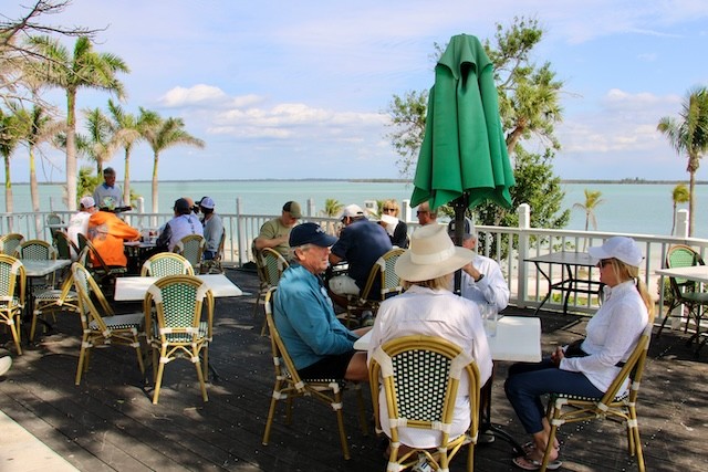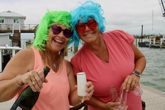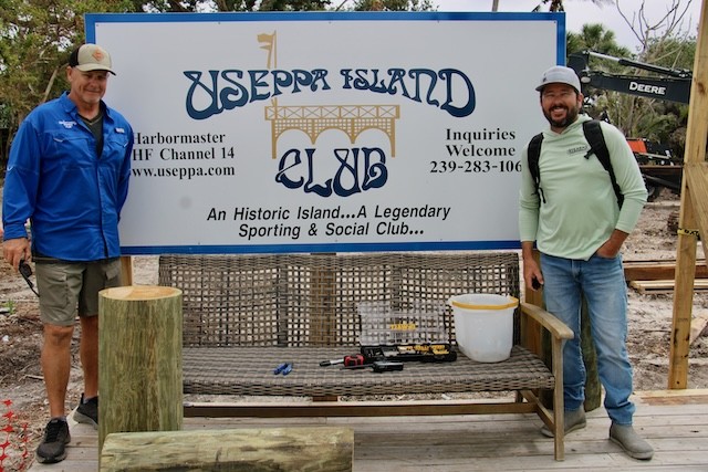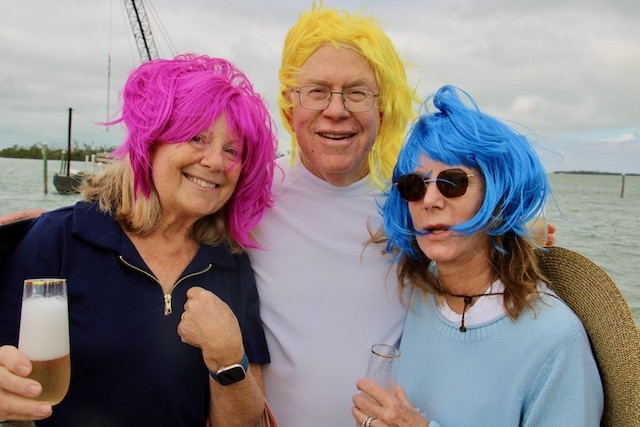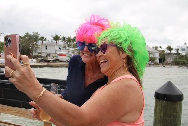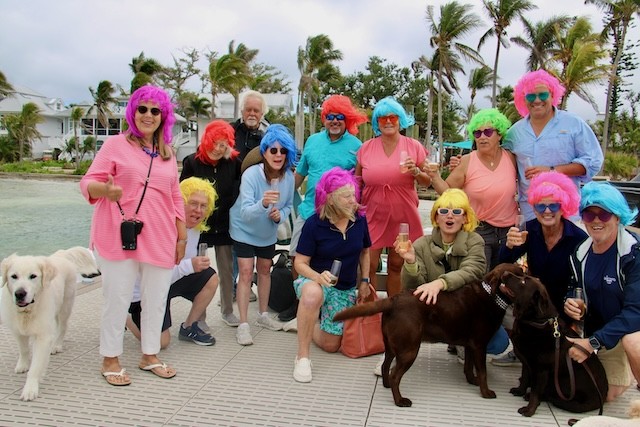 Happy Hours on Useppa - Thoughts and Pictures by UseppaGin - Friendships, families, Friday night cocktails, lunch on the Collier Patio, Island walks, golf cart rides, Marina rebuilding continues…. Happy Hours Are Back. The Collier Inn is now open Thursdays, Fridays, Saturdays, and Sundays. When there is room at the Marina’s main dock, Boating Members tie up and head up to the Collier Inn Patio for lunch and an afternoon at the pool. An award-winning chef and a new menu make every meal great. Useppa neighbors in fancy wigs welcomed a friend arriving on the launch. Gracie wore wigs like theirs when she was their elite hostess last year on a wine cruise in France. Captiva Cruises will be back two days a week. Sunday afternoon there will be a mini–Cotton Club showcasing Mattlee Crew playing the best of funk, blues, and classic rock at Rendezvous Cottages. The sun is shining. Islanders are smiling!