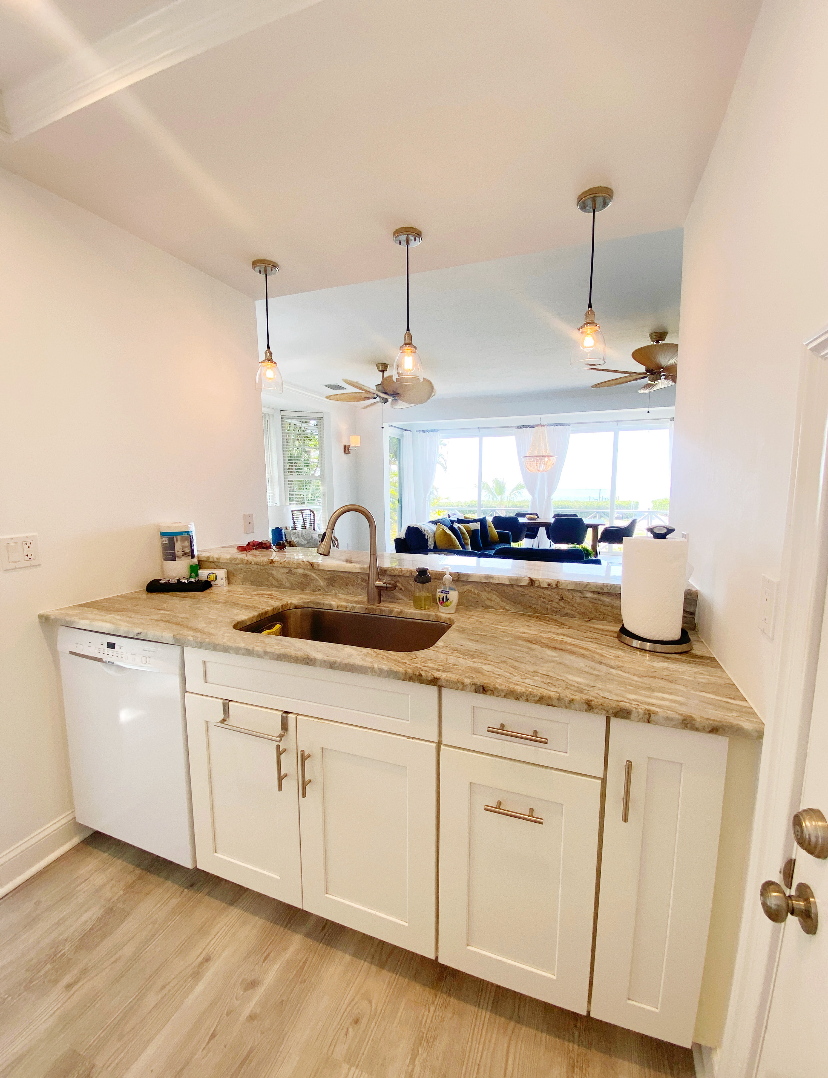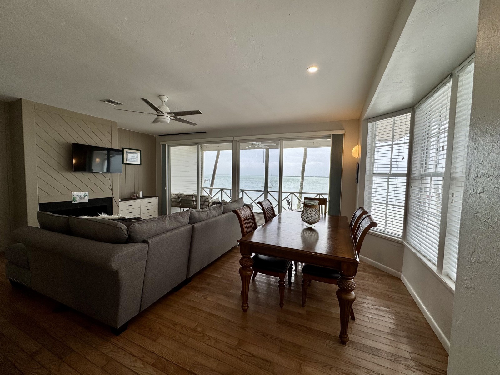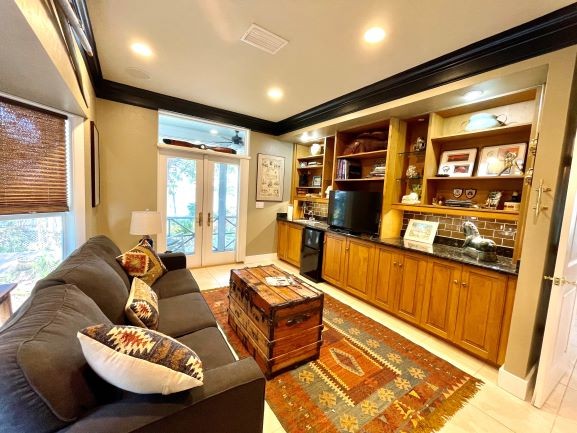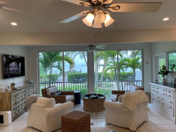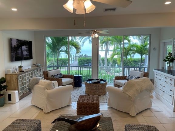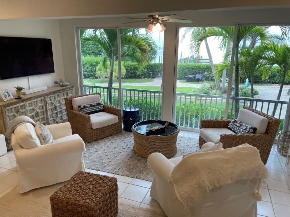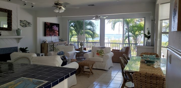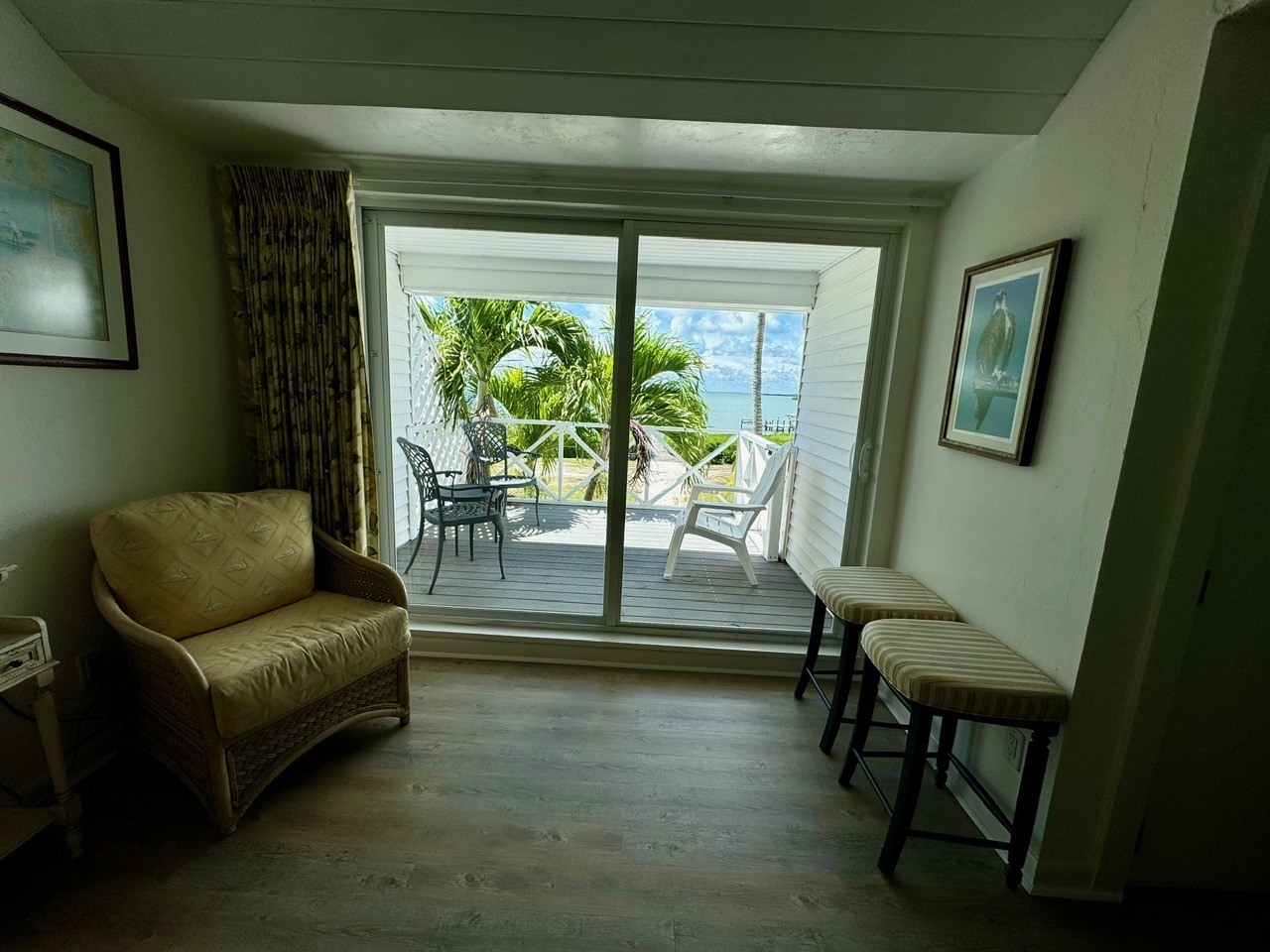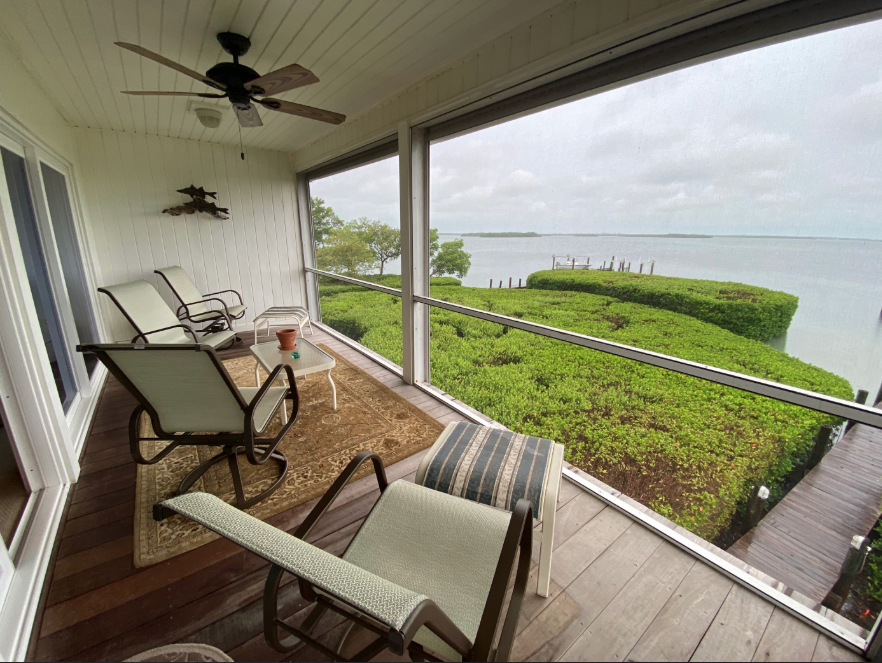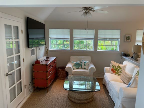 205A is a waterfront one bedroom, one bath hotel style suite on the first floor of the guest house at Rendezvous Cottages. Located on the eastern shore of Useppa this suite was completely remodeled in 2022. The private waterfront view from your bedroom is breathtaking. In addition to the one-bedroom suite, this cottage has a huge private screened in porch which includes a mini outdoor kitchen equipped with a sink, microwave, and refrigerator. A large screen TV is in the bedroom along with free Wi-Fi. The views are amazing.