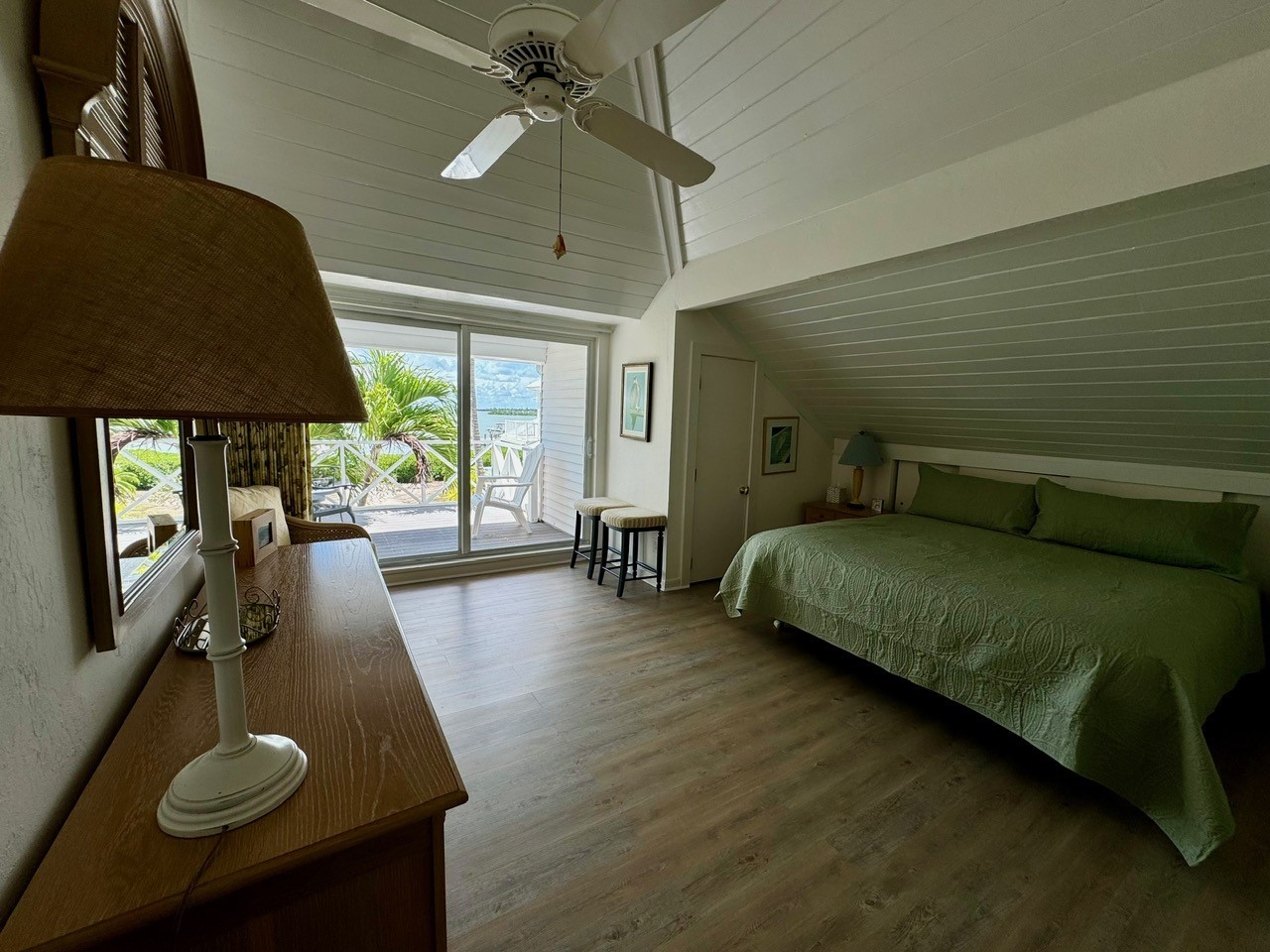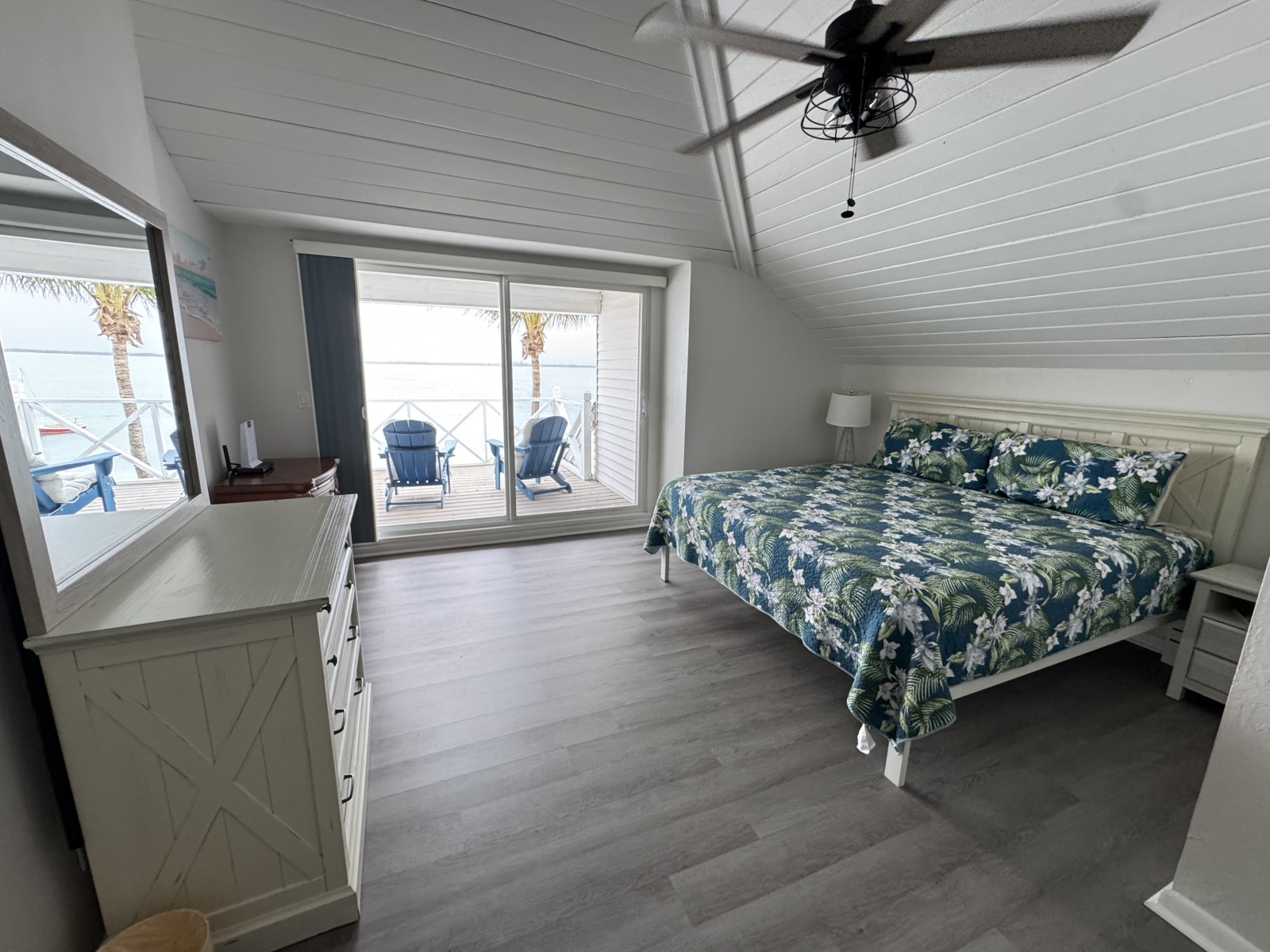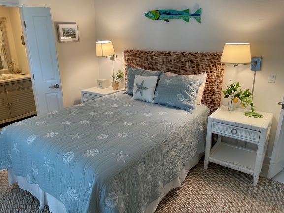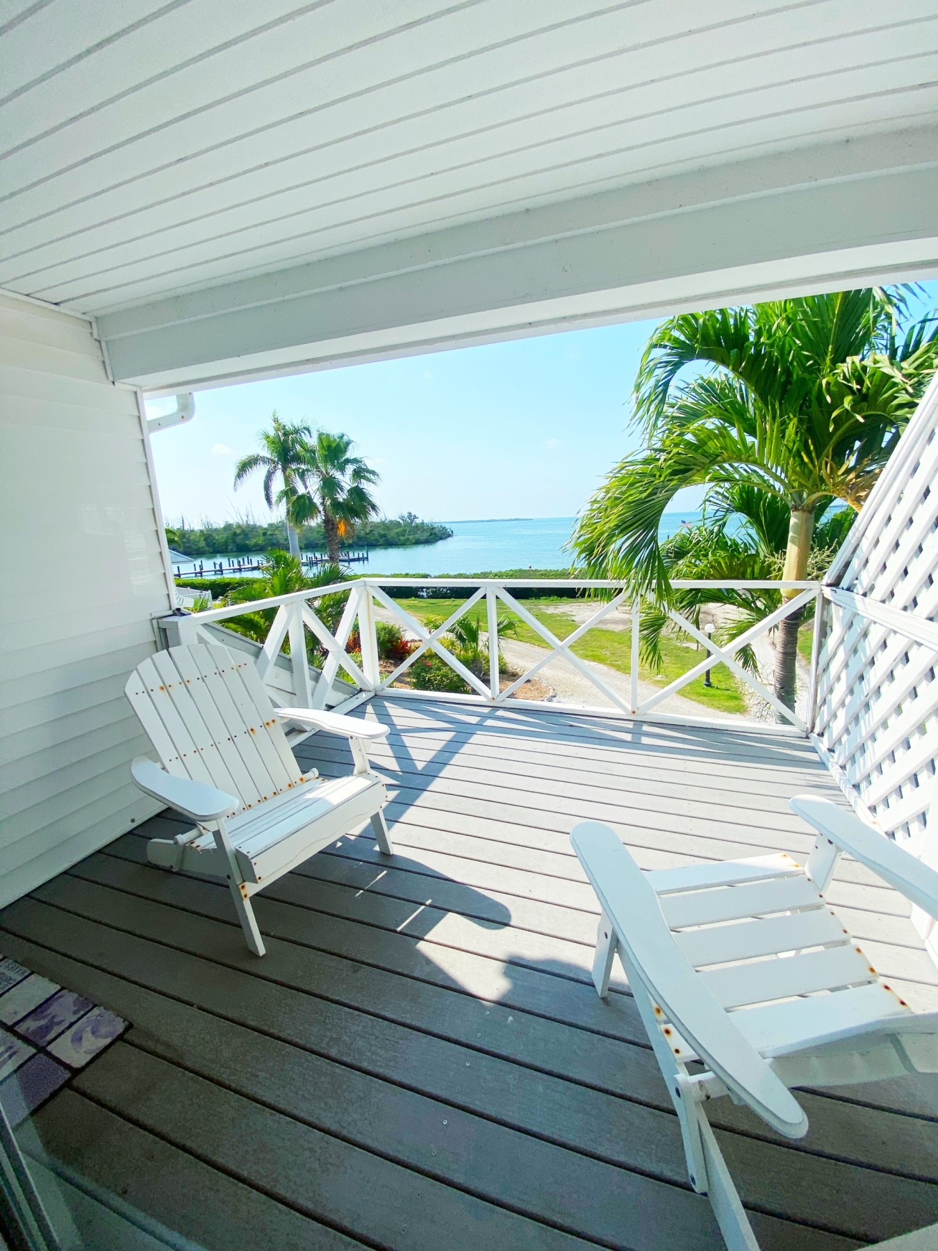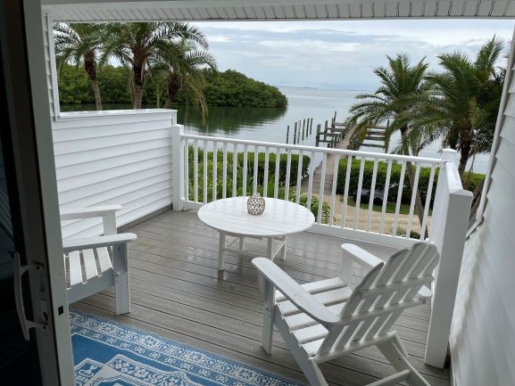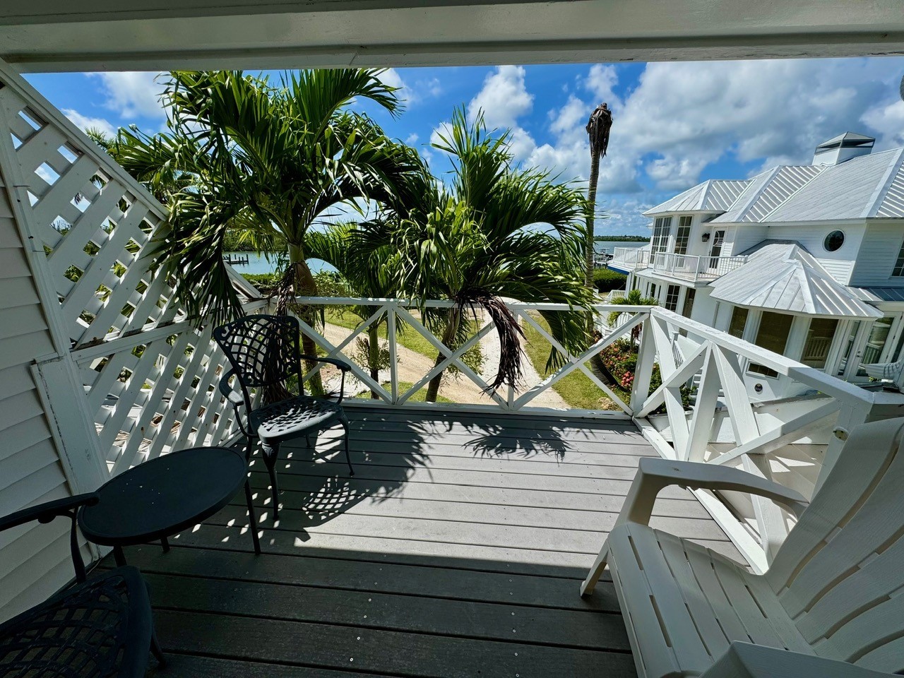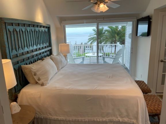 205B is a waterfront second floor one bedroom, one bath hotel style suite at the guest house of Rendezvous Cottages. Located on the eastern shore of Useppa this suite was completely remodeled in 2022. Step directly from your bedroom on to a large outdoor private deck that is perfect for sunbathing and evening drinks. Because it is on the second floor, the waterfront views from your bedroom and private deck are breathtaking. A large screen TV is in the bedroom along with free Wi-Fi.