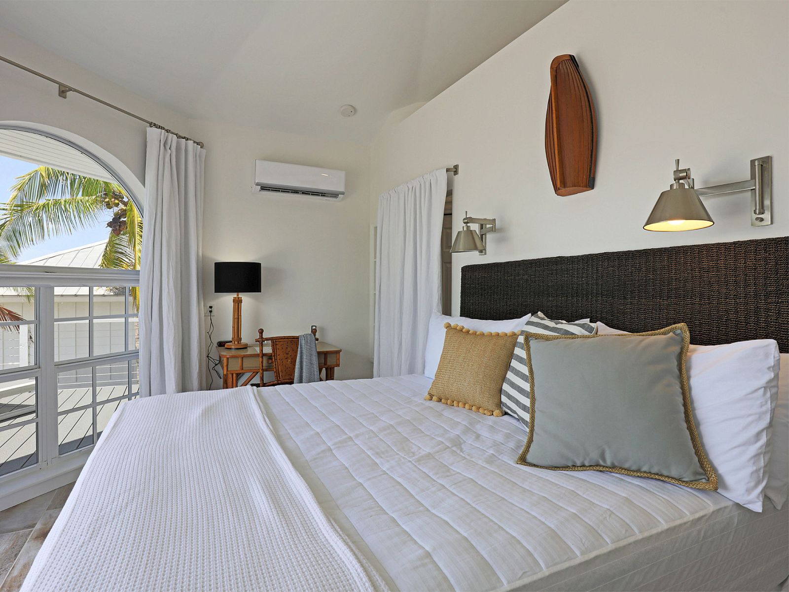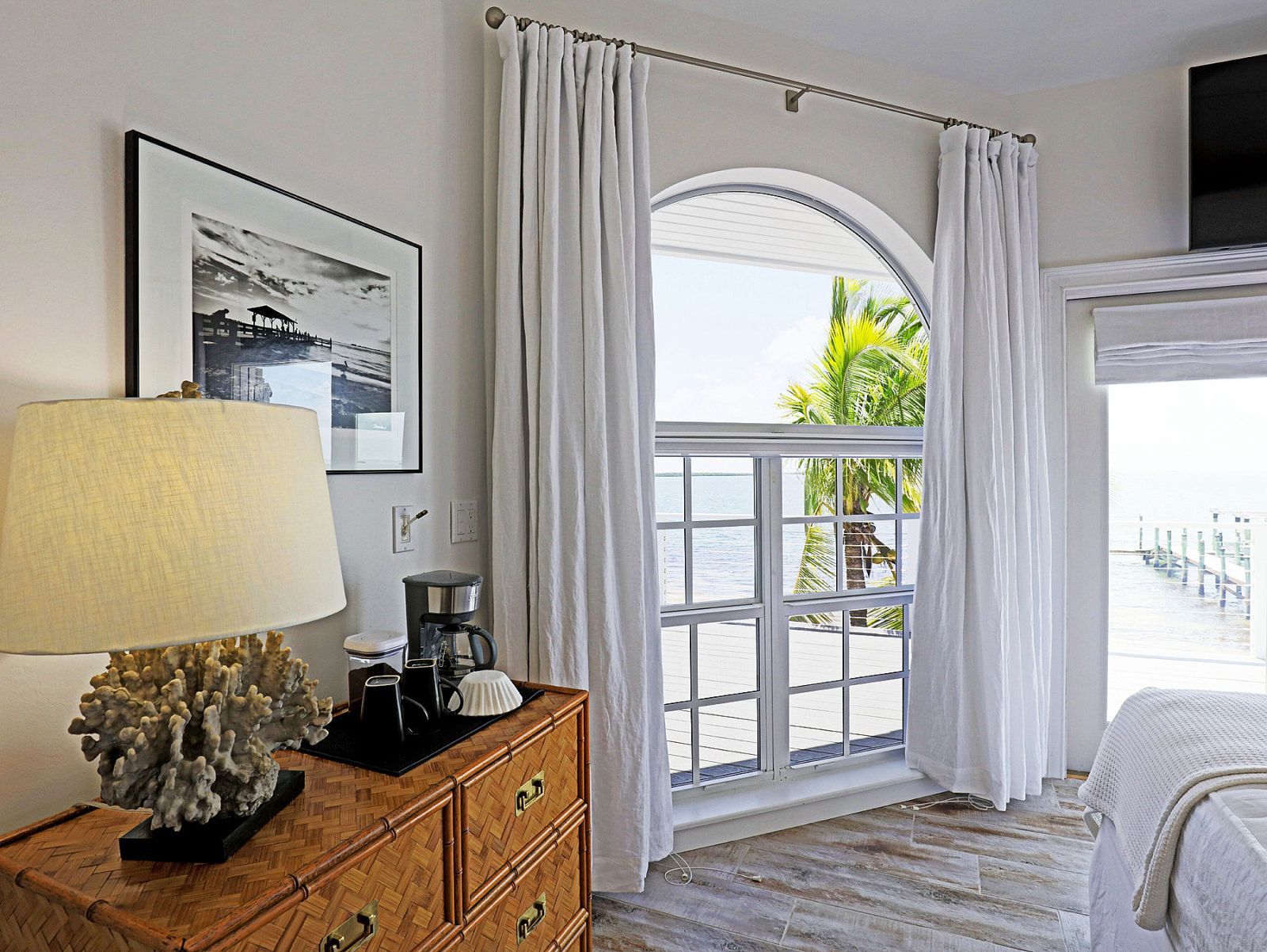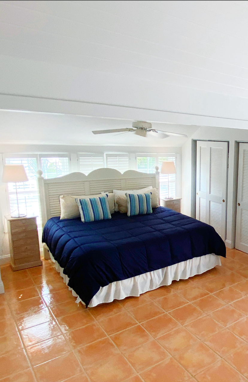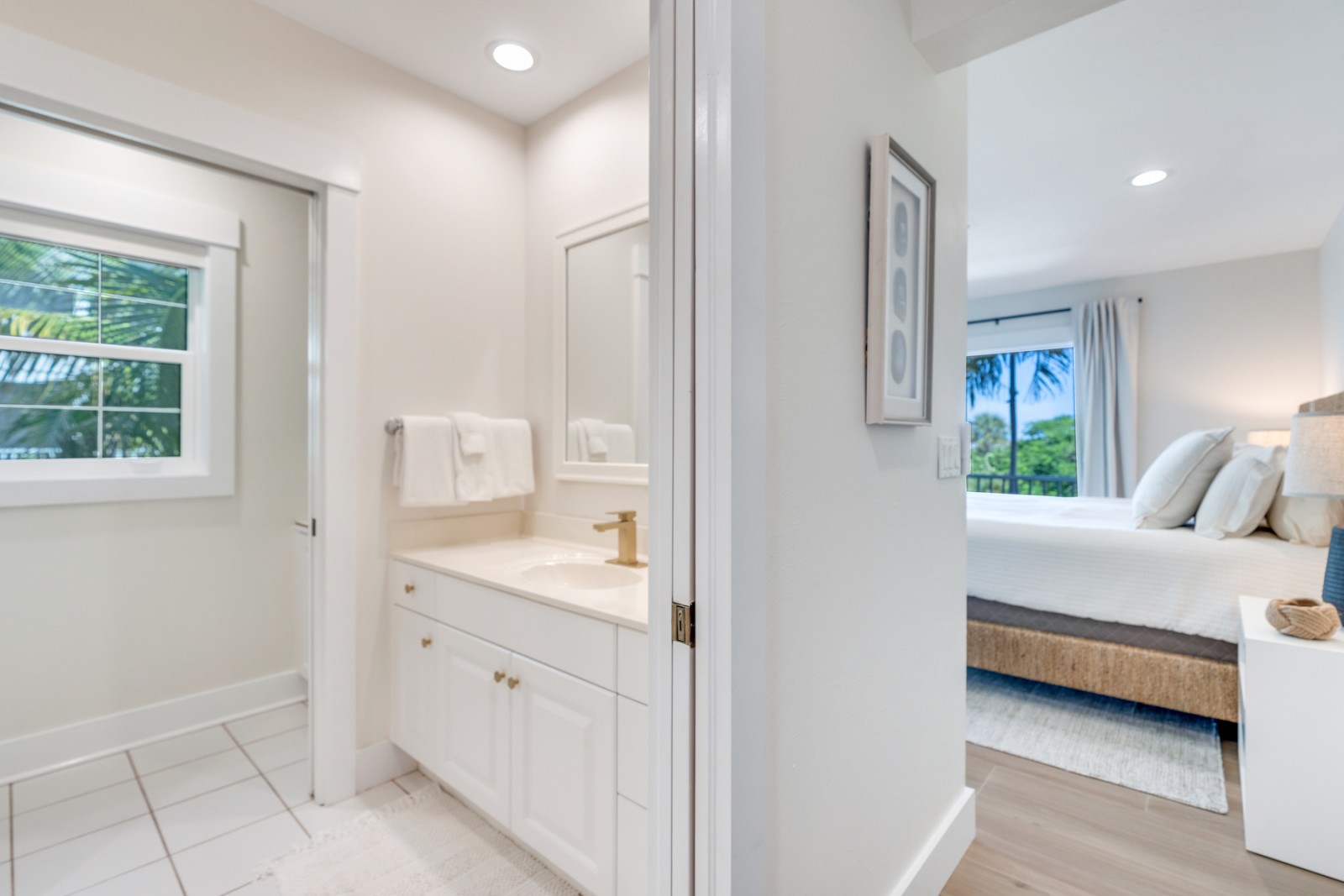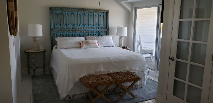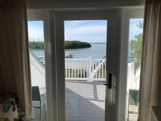 205B is a waterfront second floor one bedroom, one bath hotel style suite at the guest house of Rendezvous Cottages. Located on the eastern shore of Useppa this suite was completely remodeled in 2022. Step directly from your bedroom on to a large outdoor private deck that is perfect for sunbathing and evening drinks. Because it is on the second floor, the waterfront views from your bedroom and private deck are breathtaking. A large screen TV is in the bedroom along with free Wi-Fi.