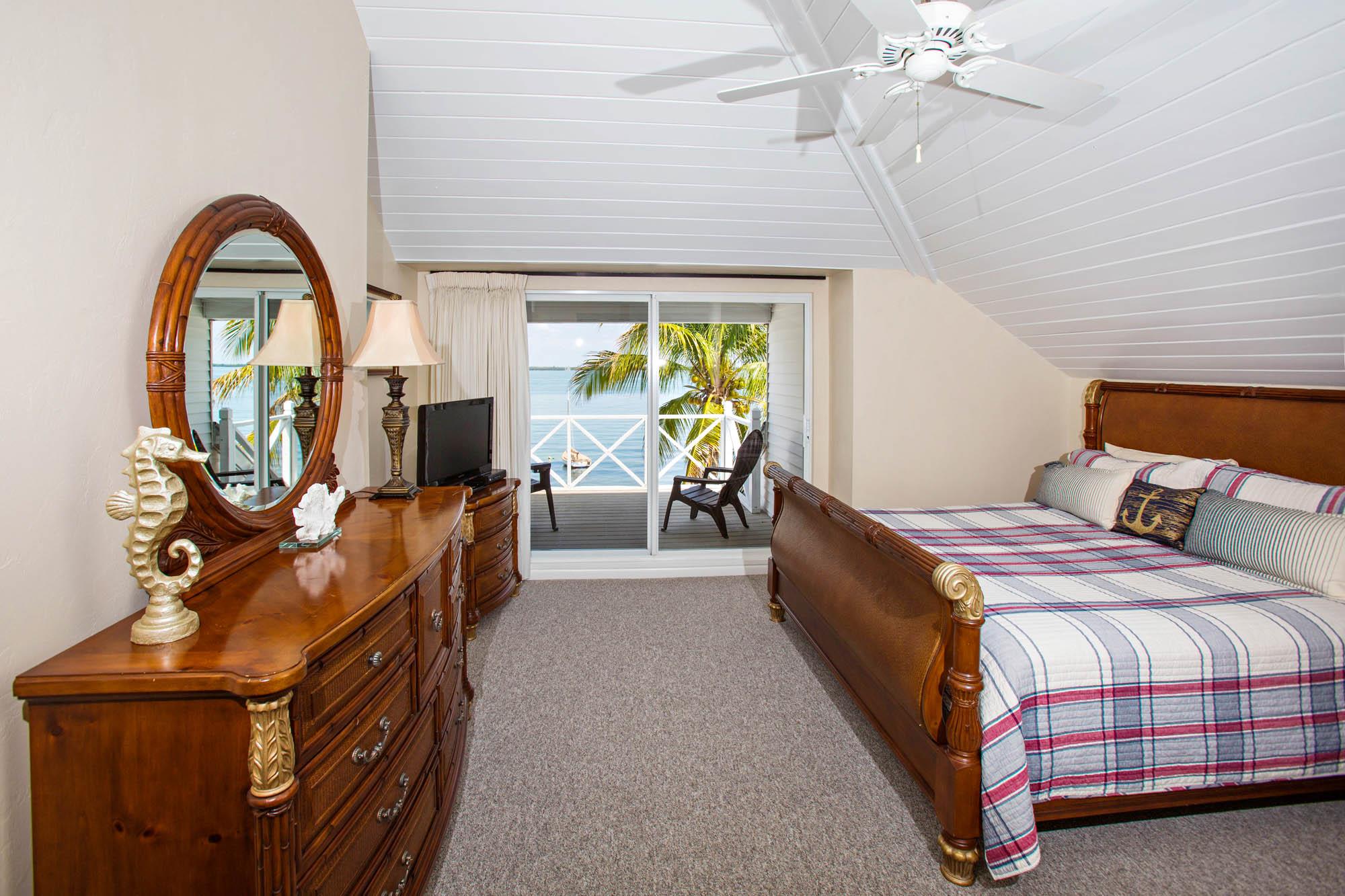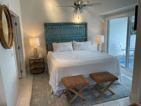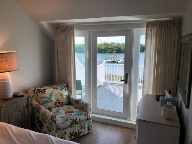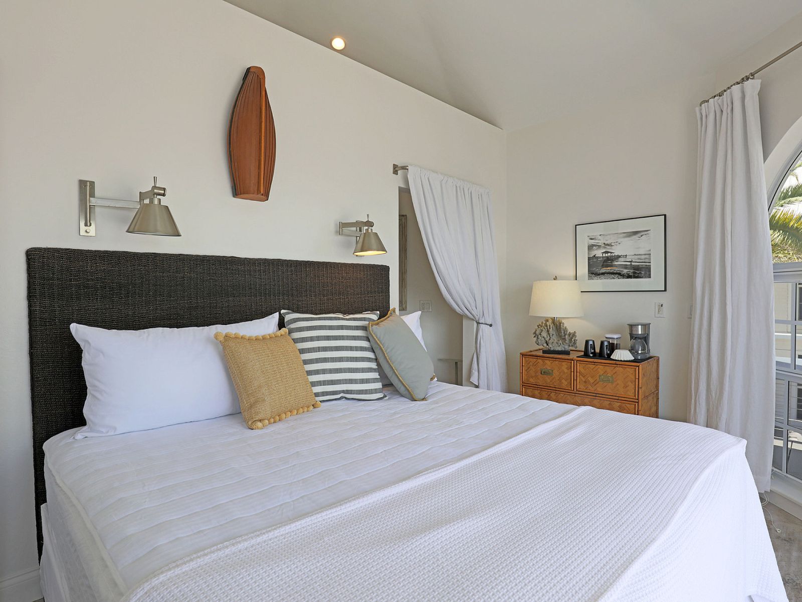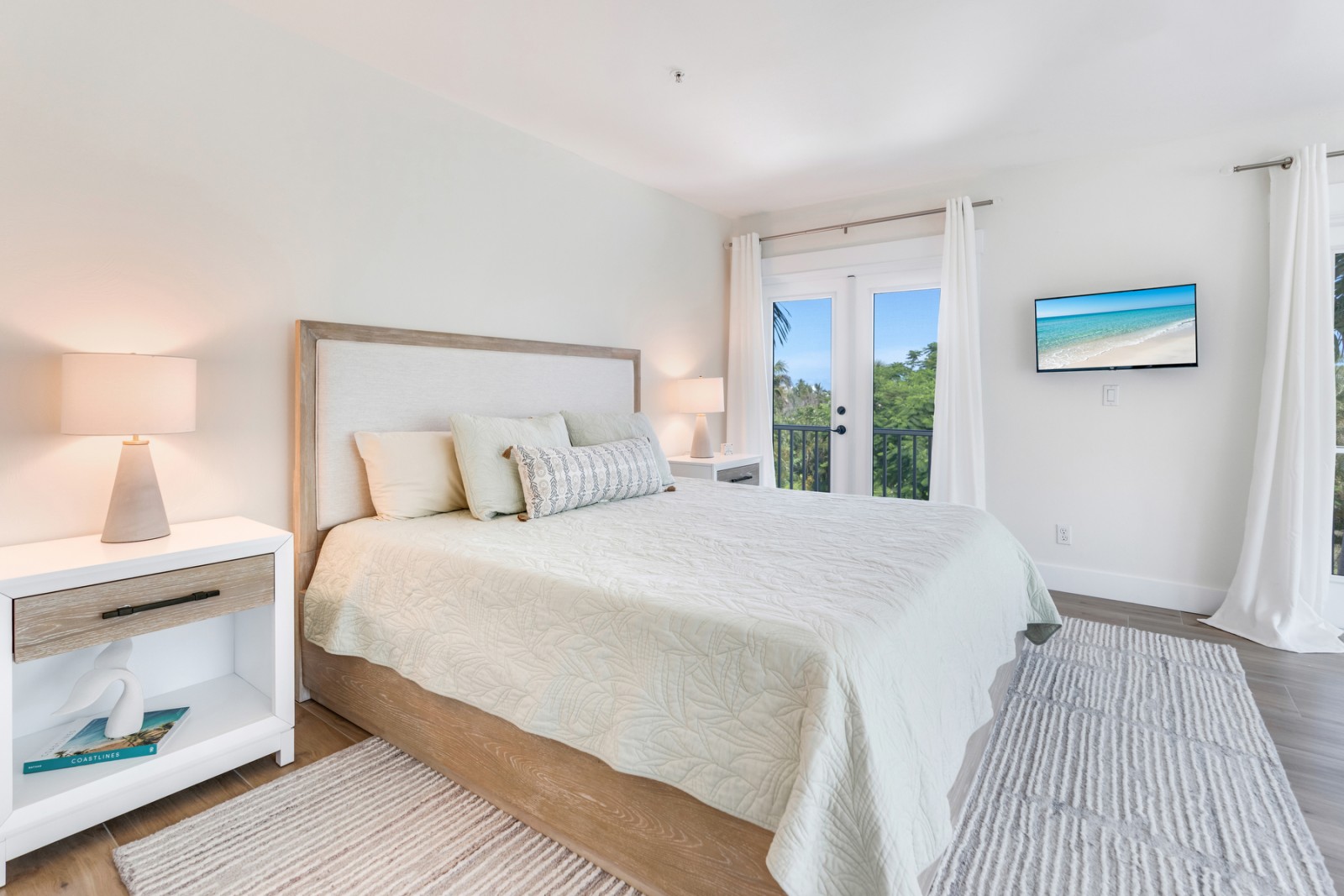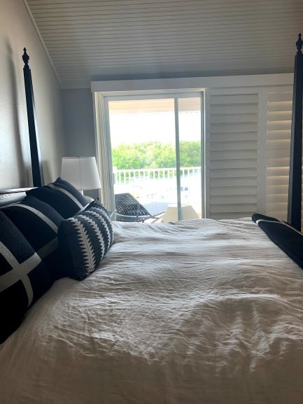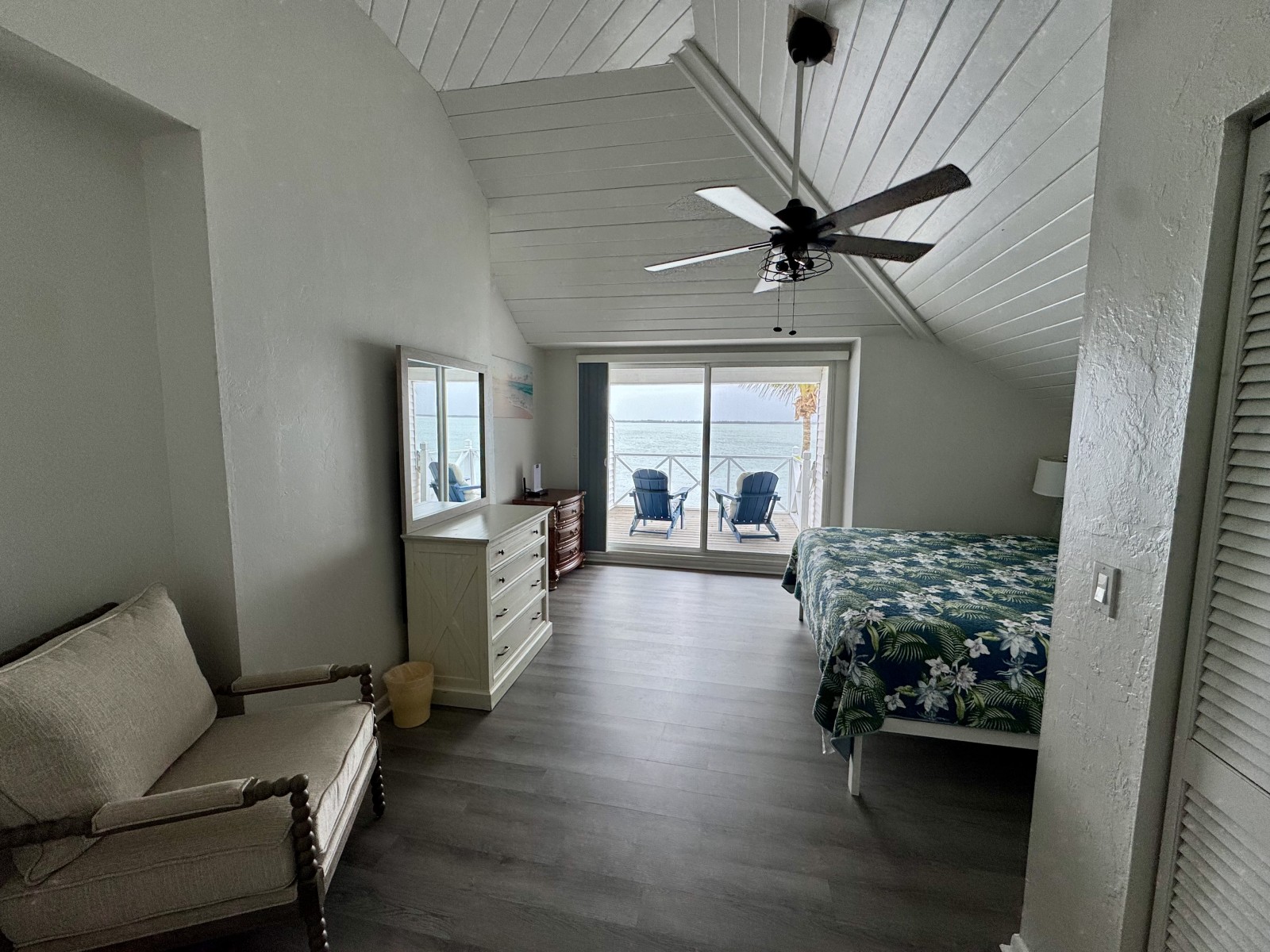 205B is a waterfront second floor one bedroom, one bath hotel style suite at the guest house of Rendezvous Cottages. Located on the eastern shore of Useppa this suite was completely remodeled in 2022. Step directly from your bedroom on to a large outdoor private deck that is perfect for sunbathing and evening drinks. Because it is on the second floor, the waterfront views from your bedroom and private deck are breathtaking. A large screen TV is in the bedroom along with free Wi-Fi.