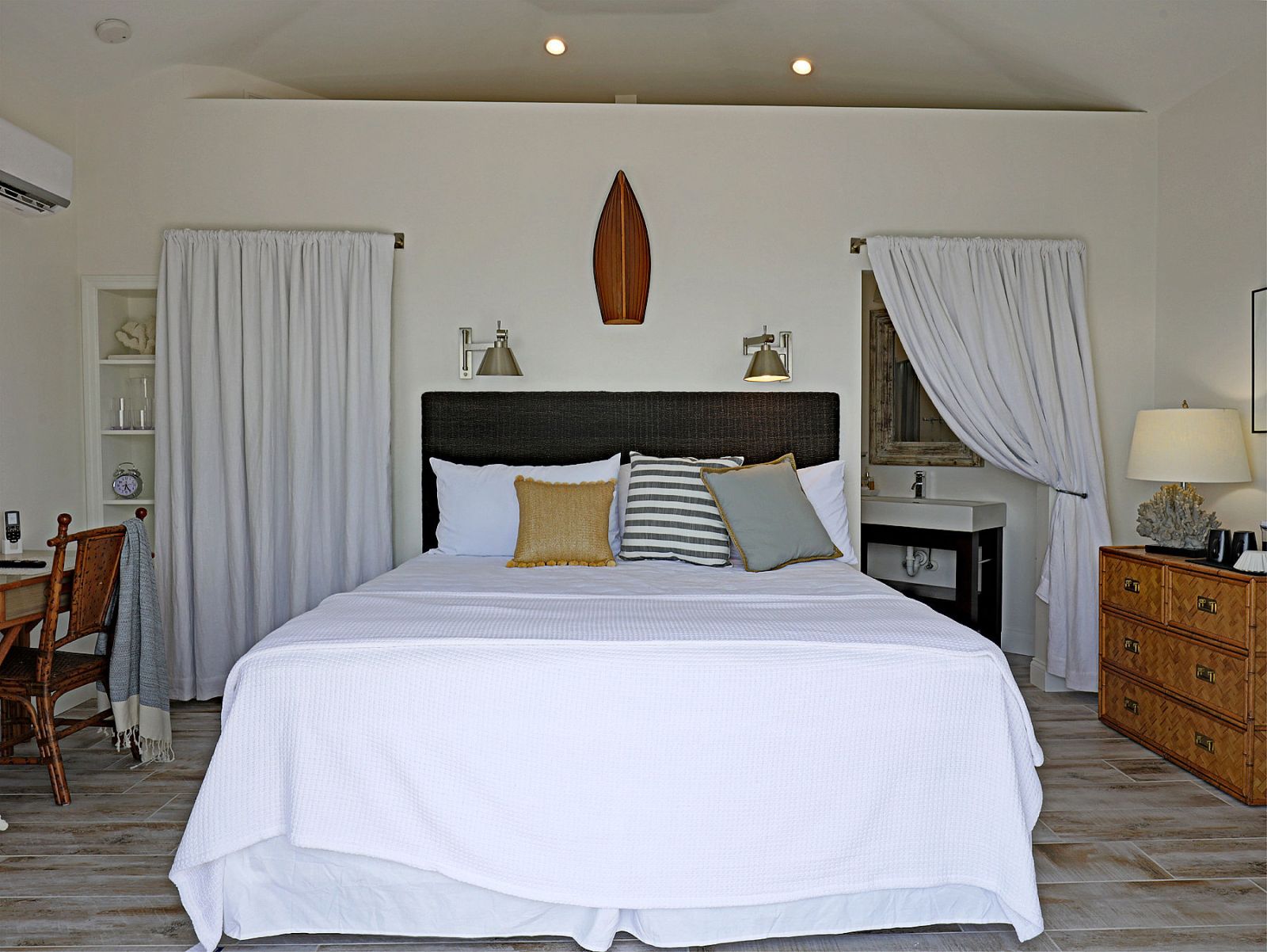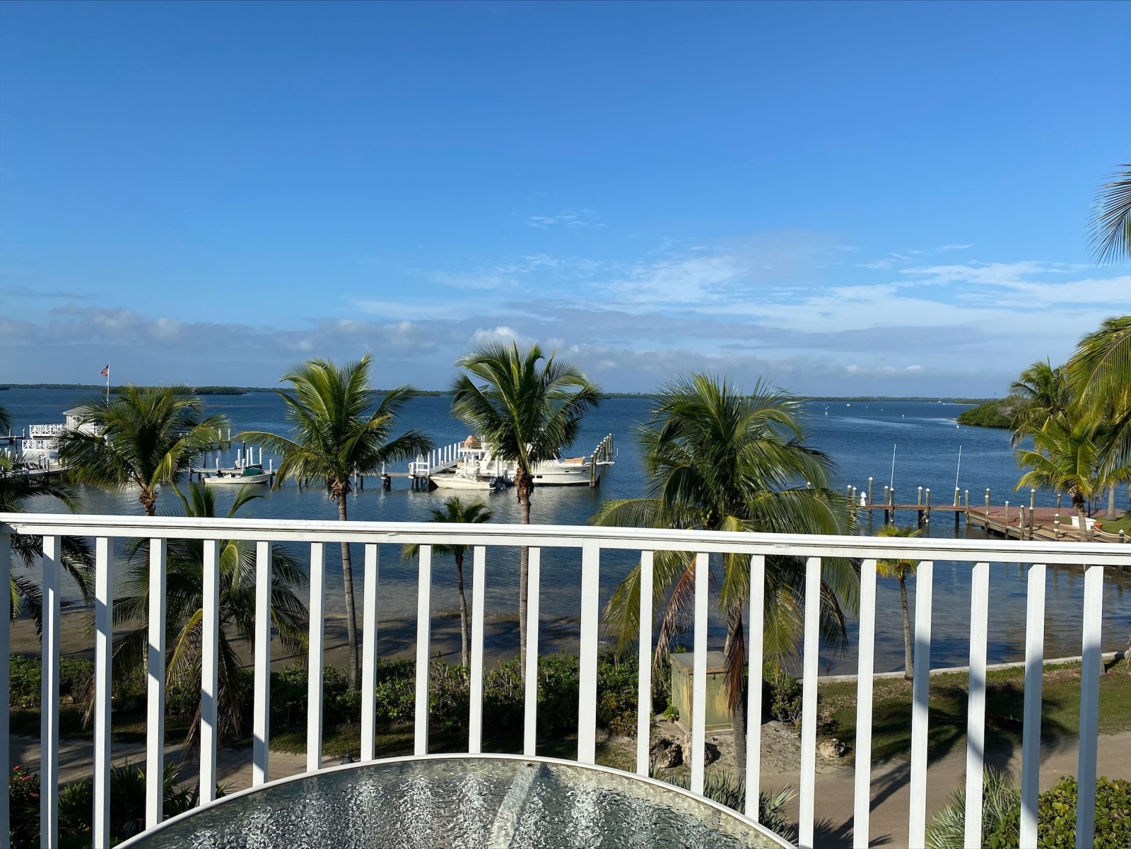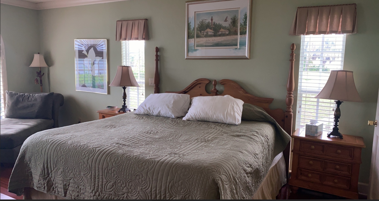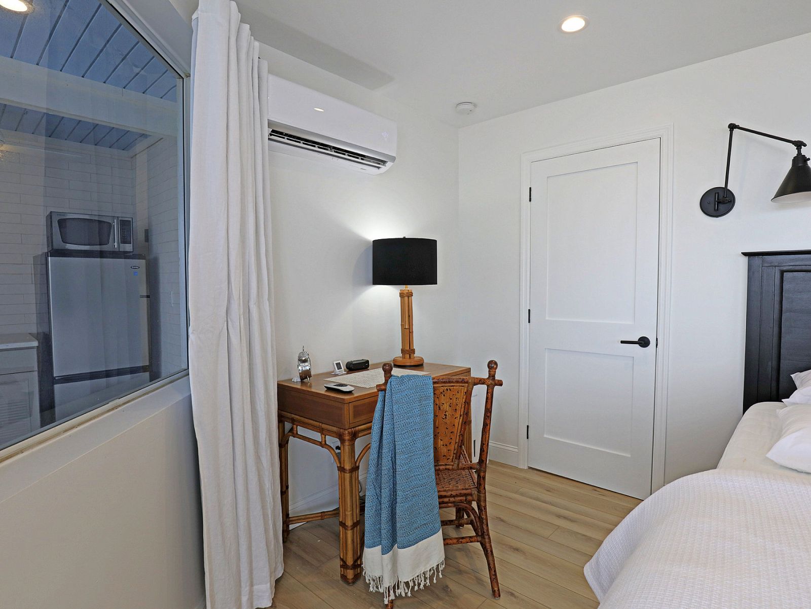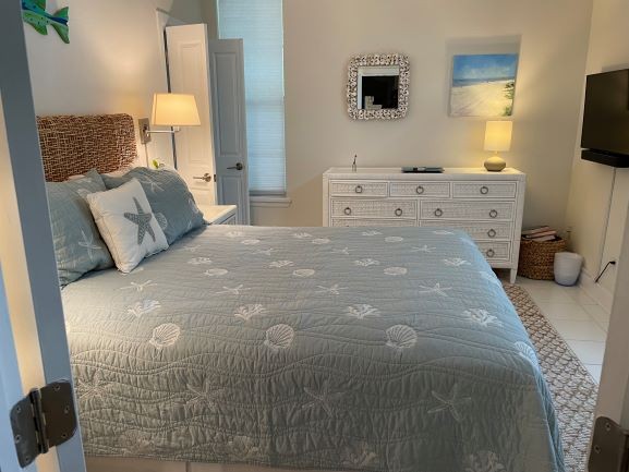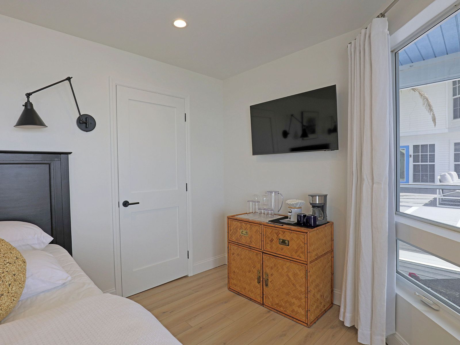 205B is a waterfront second floor one bedroom, one bath hotel style suite at the guest house of Rendezvous Cottages. Located on the eastern shore of Useppa this suite was completely remodeled in 2022. Step directly from your bedroom on to a large outdoor private deck that is perfect for sunbathing and evening drinks. Because it is on the second floor, the waterfront views from your bedroom and private deck are breathtaking. A large screen TV is in the bedroom along with free Wi-Fi.