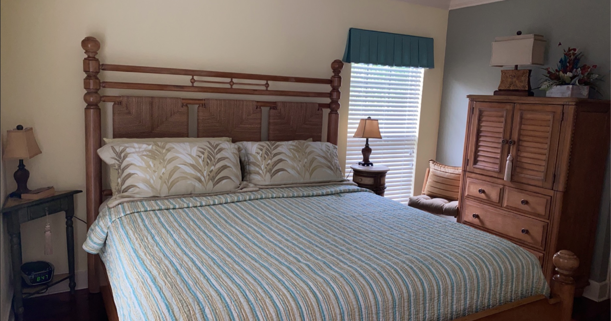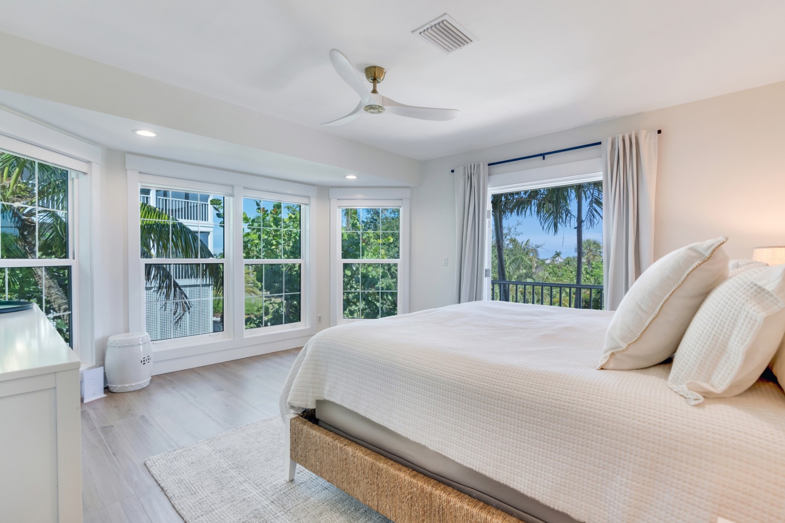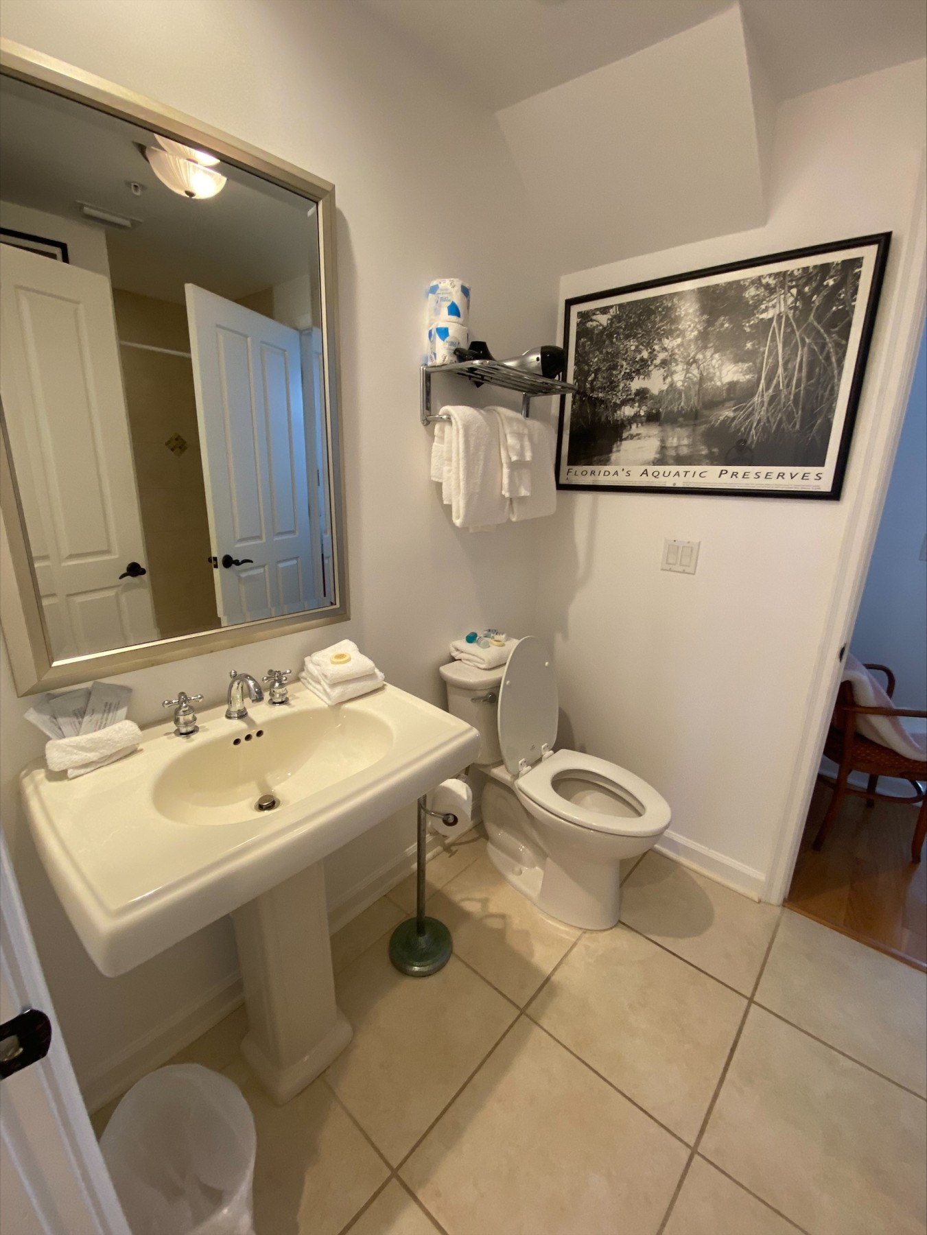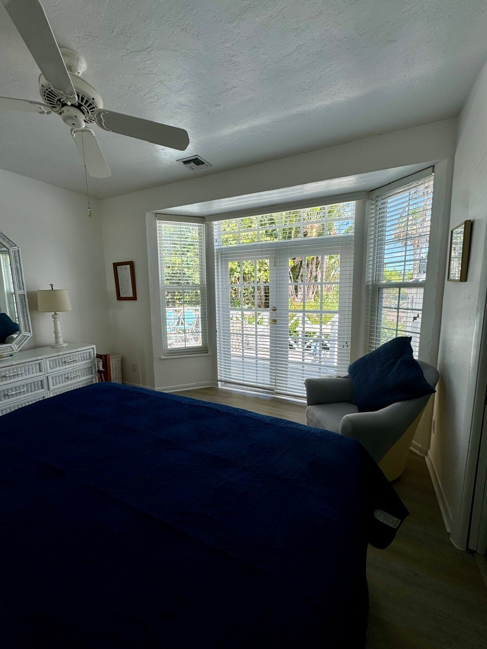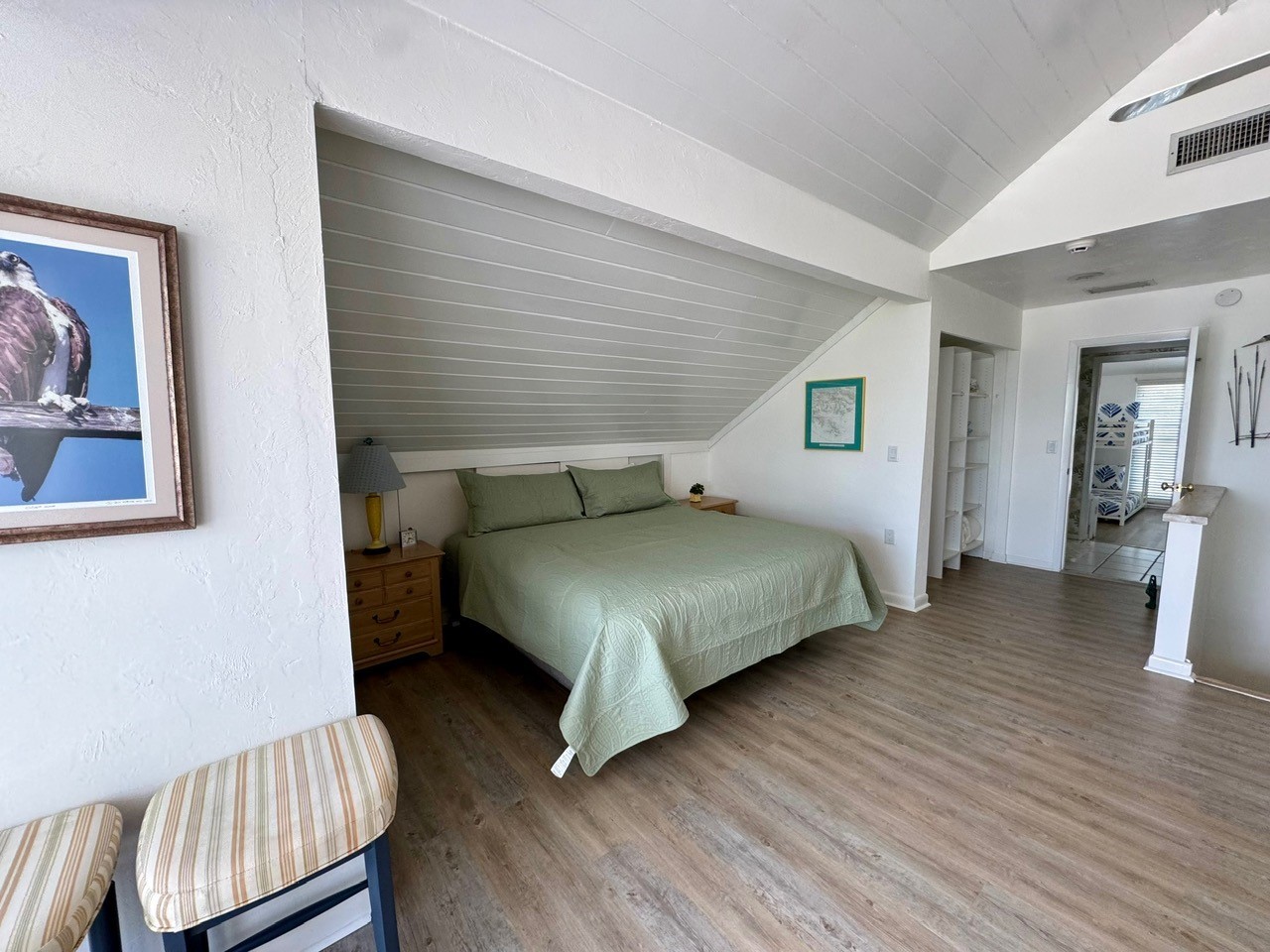 205B is a waterfront second floor one bedroom, one bath hotel style suite at the guest house of Rendezvous Cottages. Located on the eastern shore of Useppa this suite was completely remodeled in 2022. Step directly from your bedroom on to a large outdoor private deck that is perfect for sunbathing and evening drinks. Because it is on the second floor, the waterfront views from your bedroom and private deck are breathtaking. A large screen TV is in the bedroom along with free Wi-Fi.