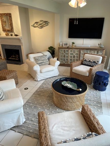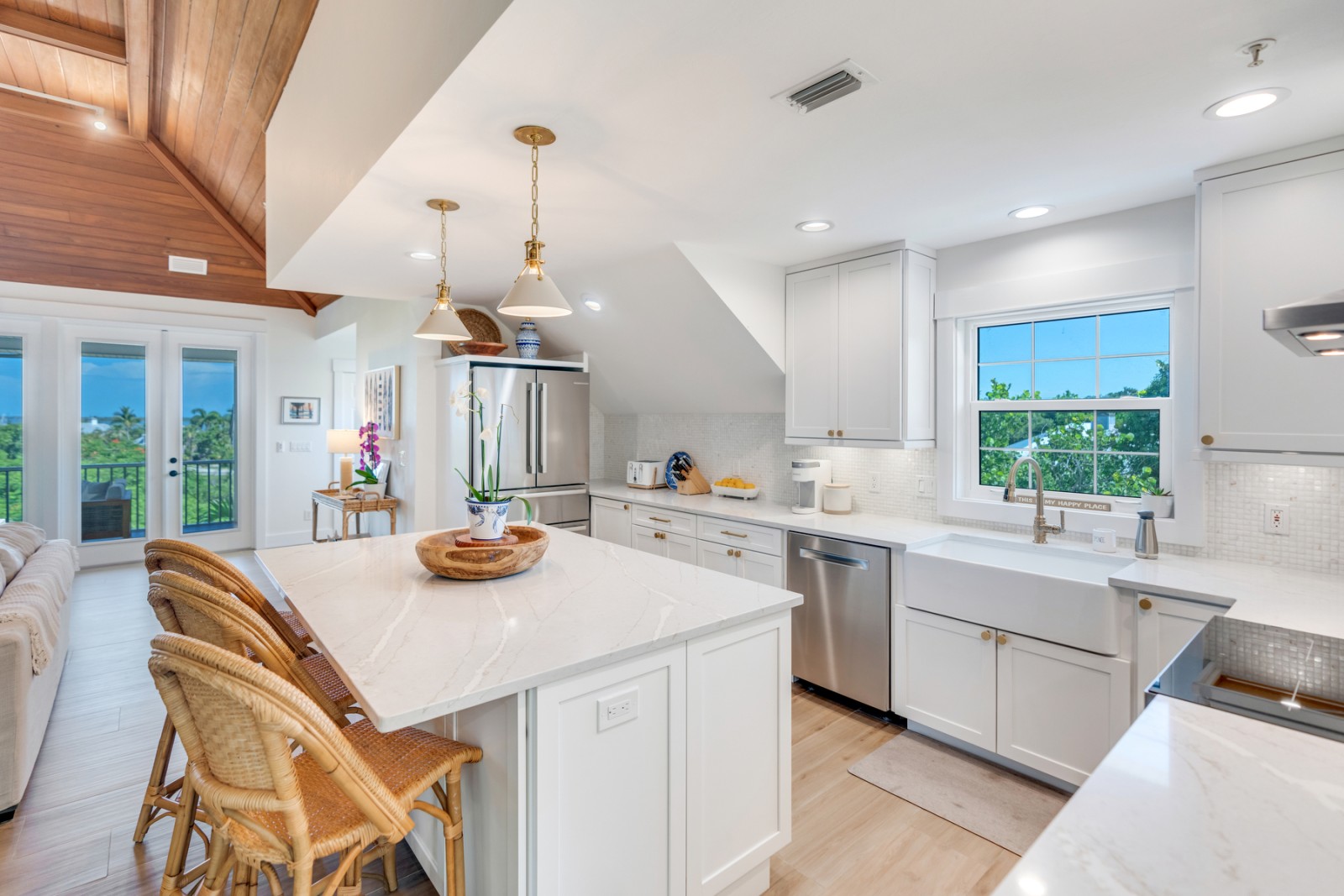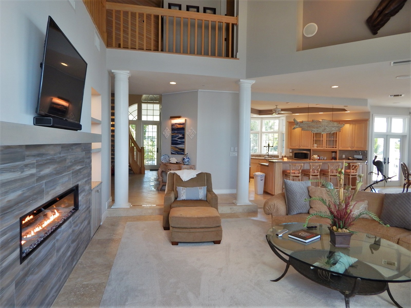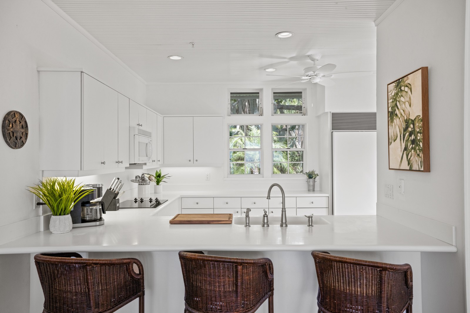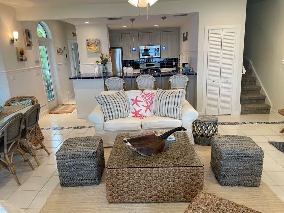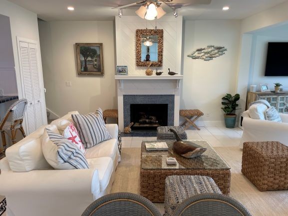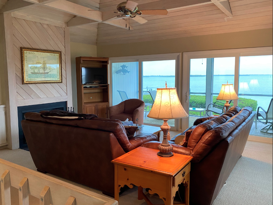 Located within Rendezvous Cottages on Useppa, 204B is the 1600 square foot two story cottage that boasts 2 bedrooms with ensuite baths, full sized laundry, living room with fireplace, and dining space for six. The fully appointed chefs’ kitchen with a five-burner gas stove will allow you to prepare glorious meals for your family and friends. Enjoy spectacular sunrises while savoring your morning cup of coffee from the 2nd floor screened porch, overlooking direct waterfront on the eastern shore of Useppa. TVs are in the living room and all bedrooms with free Wi-Fi access.